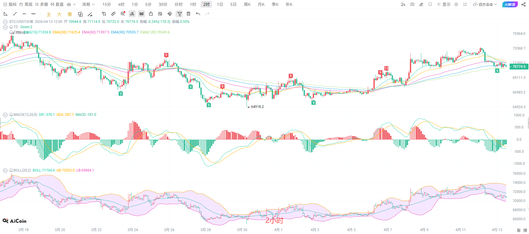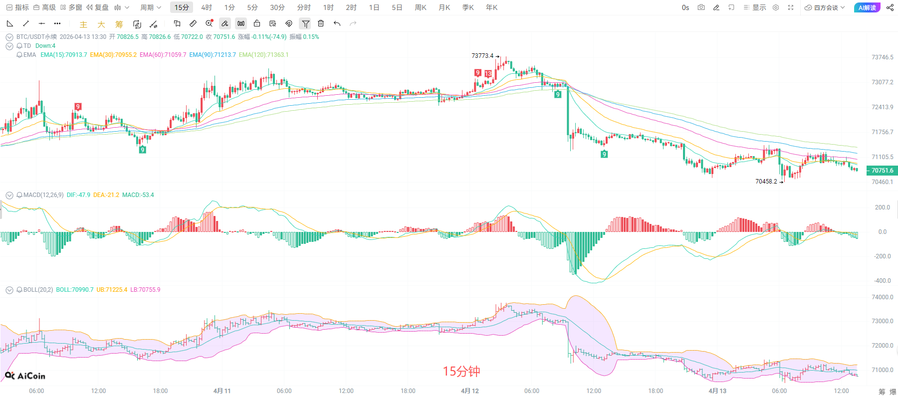 十五分钟K线围绕70800窄幅震荡,布林带收口,多空博弈加剧。均线系统呈弱势排列,价格受 EMA15压制,MACD指标在零轴下方运行,调整信号延续。当前走势属于高位回调后的整理,下方70400附近为短期支撑,上方71200为压力,若无法快速收复EMA15,大概率延续震荡下探,回踩2小时级别支撑。