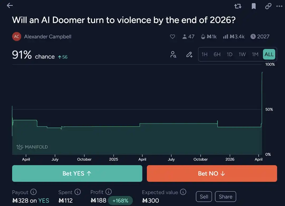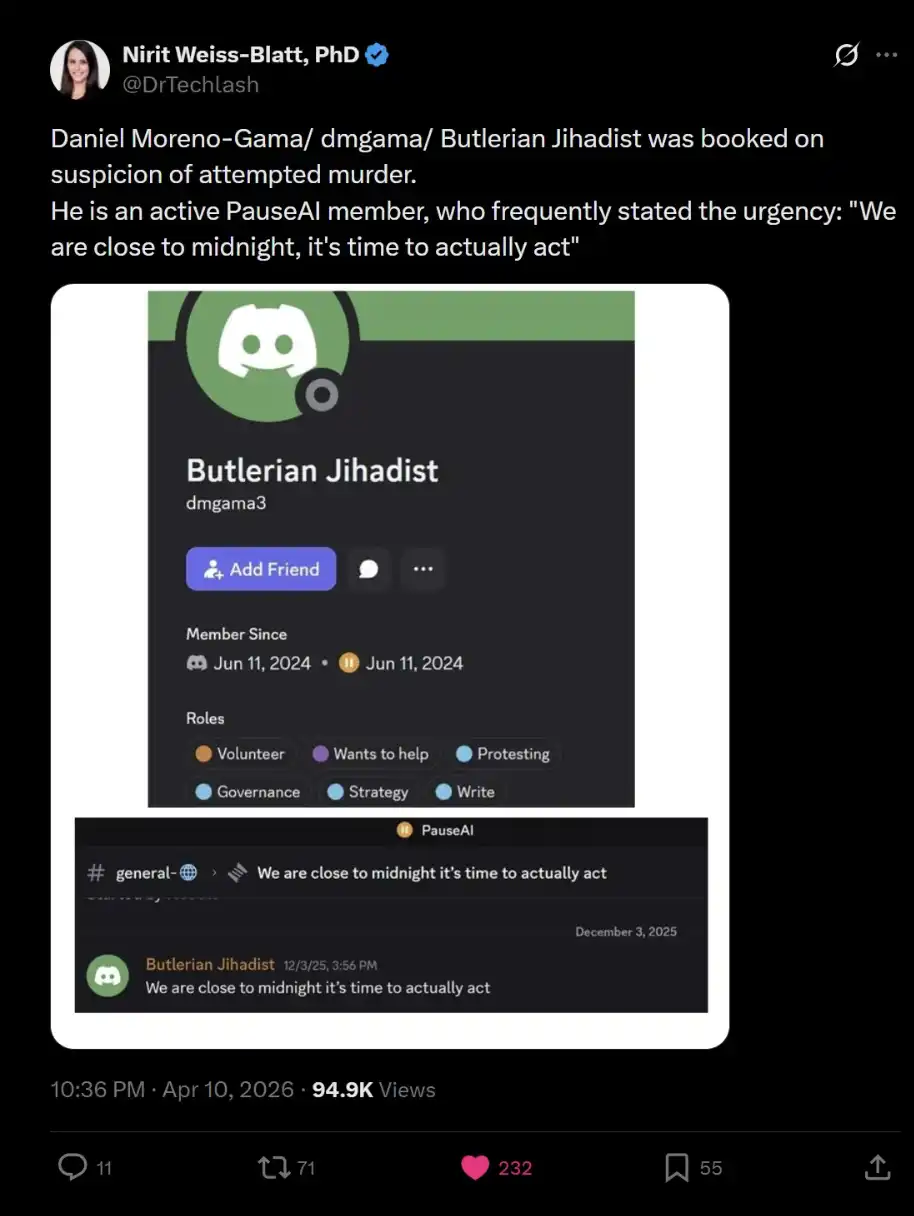 从「AI 将导致人类灭绝」的高度确定性判断出发,经由「必须不惜一切代价降低风险」的推理,这套逻辑逐步滑向对现实行动的正当化。当一种世界观不断强化其「生存级威胁」的叙事,并以此重构道德优先级时,行动的边界也随之被重新定义——原本低成本的言论,开始具备被执行的可能。