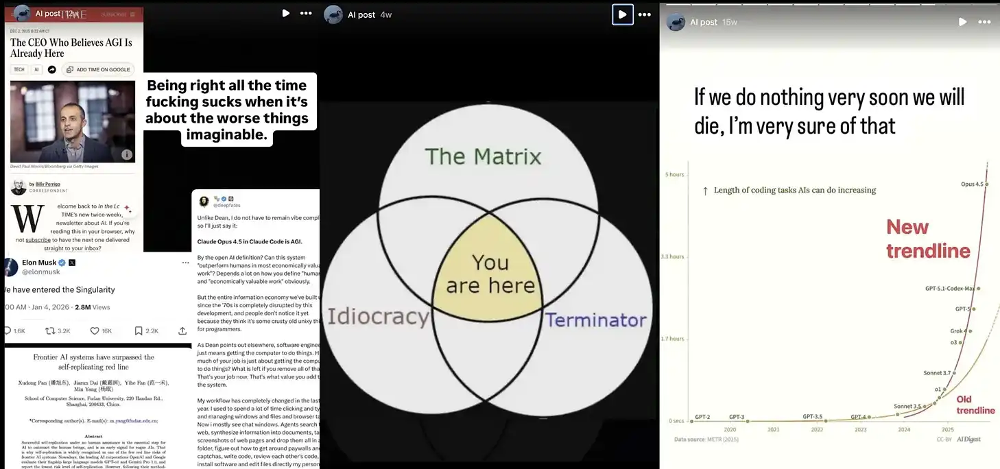 他的 Instagram 几乎被一种末日情绪内容占据:能力曲线配文「如果我们很快不采取行动,我们就会死去」,还有把现实置于《黑客帝国》《终结者》和《蠢蛋进化论》交集之中的维恩图。