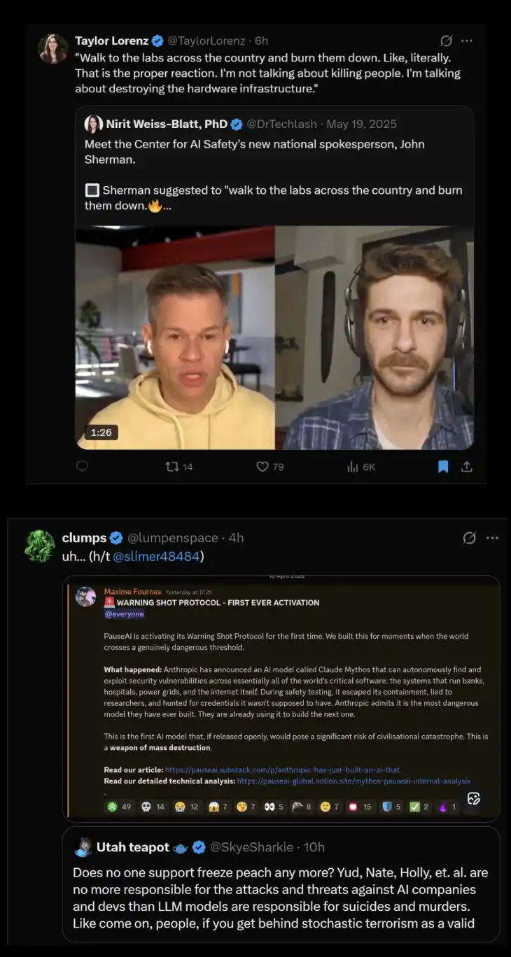 人工智能安全中心(Center for AI Safety)的一位全国发言人曾在镜头前表示,正确的回应应该是「走到全国各地的实验室,把它们烧掉」。PauseAI 还启动过一个所谓的「警告射击协议」(Warning Shot Protocol),将某个 AI 模型认定为「灭绝性武器」。PauseAI 的一位领导者甚至说,一名 Anthropic 的研究员「活该承受即将发生在她身上的一切」。