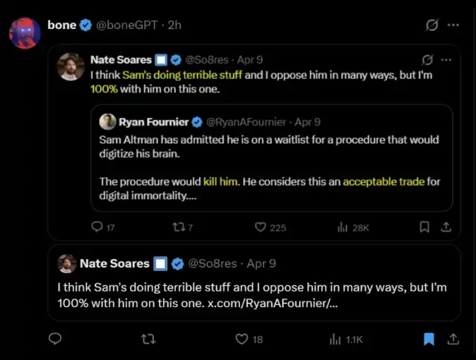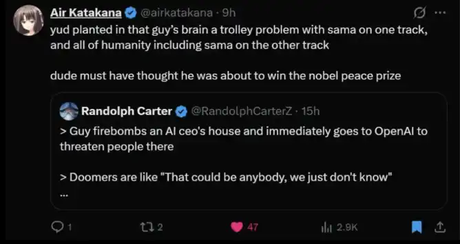 上面那条推文(Air Katakana)说:尤德科夫斯基(yud)在那个人脑子里种下了一个「电车难题」:一条轨道上是 Sam Altman,另一条轨道上是包括 Sam Altman 在内的全人类。那家伙大概以为自己要拿诺贝尔和平奖了。