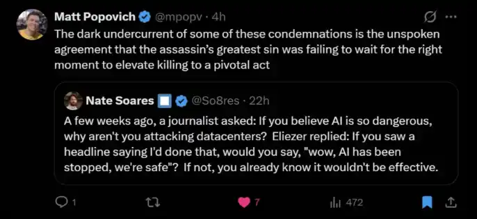 就在袭击发生前几周,一名记者曾问尤德科夫斯基:既然 AI 如此危险,你为什么不去袭击数据中心?他通过索亚雷斯转述的回答是:「如果你看到一条新闻,说我这么做了,你会觉得『哇,AI 已经被阻止了,我们安全了』吗?如果不会,那你其实已经知道,这种做法并不奏效。」