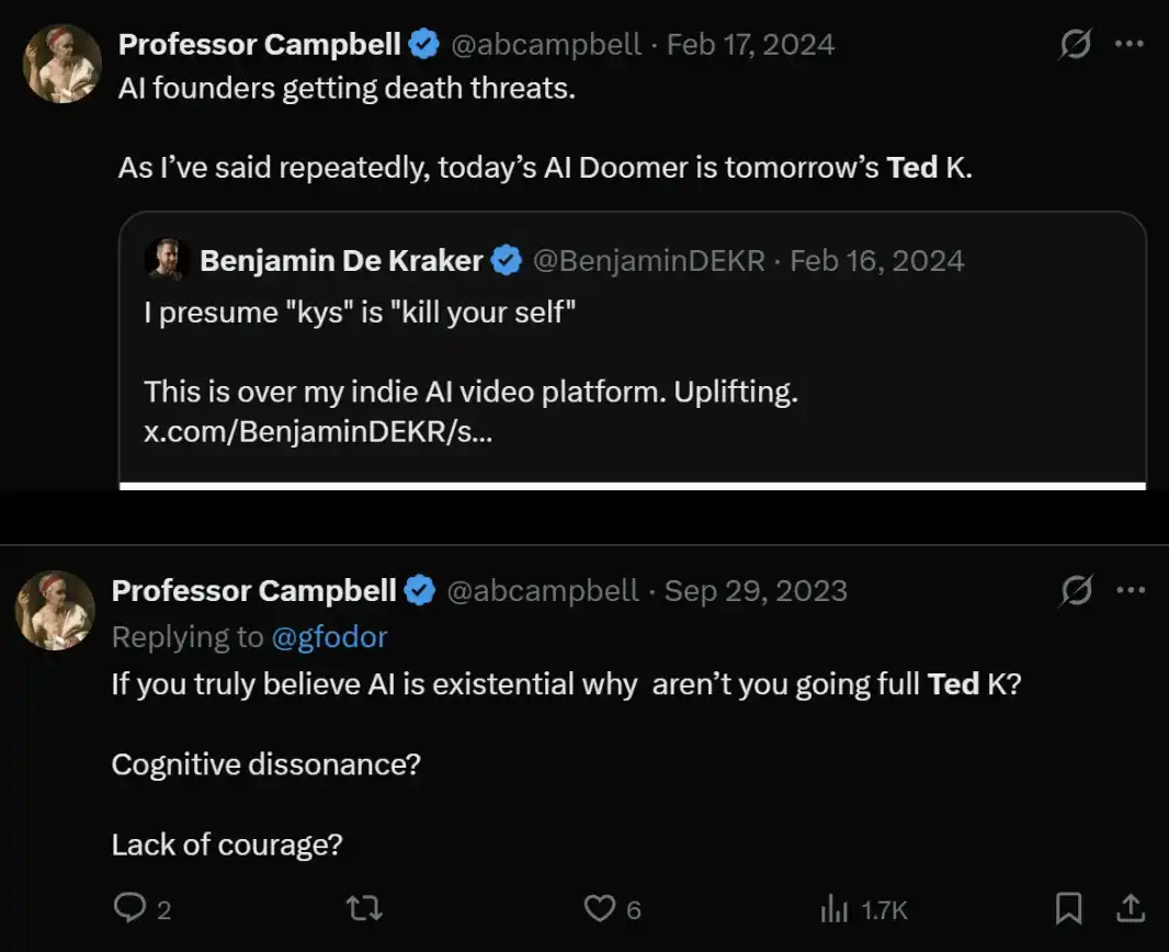 博弈论里有个术语叫「廉价信号」(cheap talk):指的是几乎没有成本的表态,但终究要面对现实的约束。一开始大家只是低成本地说一些极端观点,但一旦把问题定义为「人类生存危机」,这些观点就可能被人当真,从而为极端行为提供正当性。
