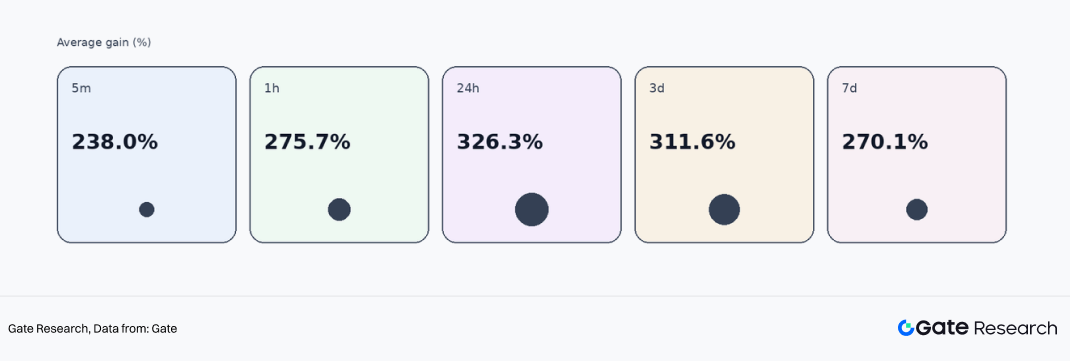 进一步看上涨项目的平均涨幅,则可以更清楚地理解收益弹性。Q1 中,上涨项目在 5 分钟、1 小时、24 小时、3 日和 7 日维度的平均涨幅分别为 238.0%、275.7%、326.3%、311.6% 和 270.1%。这说明,Gate 的优质新币一旦在早期形成正反馈,其价格释放空间依然相当可观。特别是在 24 小时与 3 日窗口,平均涨幅都维持在 300% 左右,这意味着优质项目的财富效应并未在弱市中消失,而是更集中地体现在经过筛选后的部分高质量标的上。