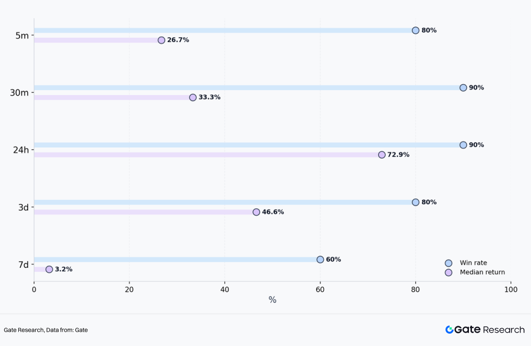 与此同时,7 日中位数接近持平,也说明另一个事实。新币的优势主要集中在上市后的早期价格发现阶段,而非无限延续。到了 7 日以后,市场已经进入更充分的分化和淘汰阶段,项目之间的差异会迅速扩大。因此,对用户来说,不是所有新币都应该长期持有,而是在上市后的前 24 小时到 3 日窗口内,整体呈现出更清晰、更稳定的收益机会密度。