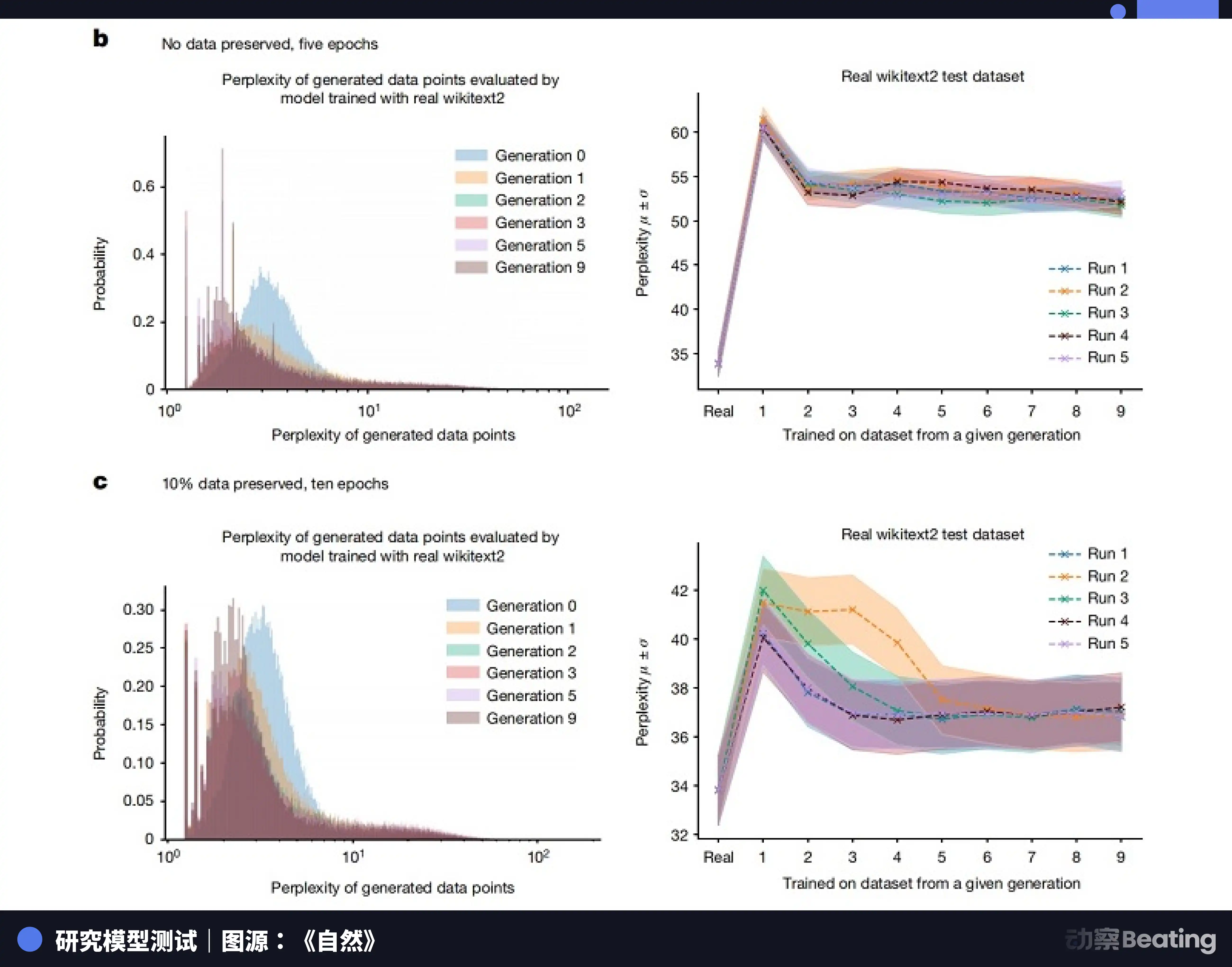 《自然》2024 年也发表了一篇研究论文,指出用 AI 生成的数据集训练未来几代机器学习模型,会严重污染它们的输出。