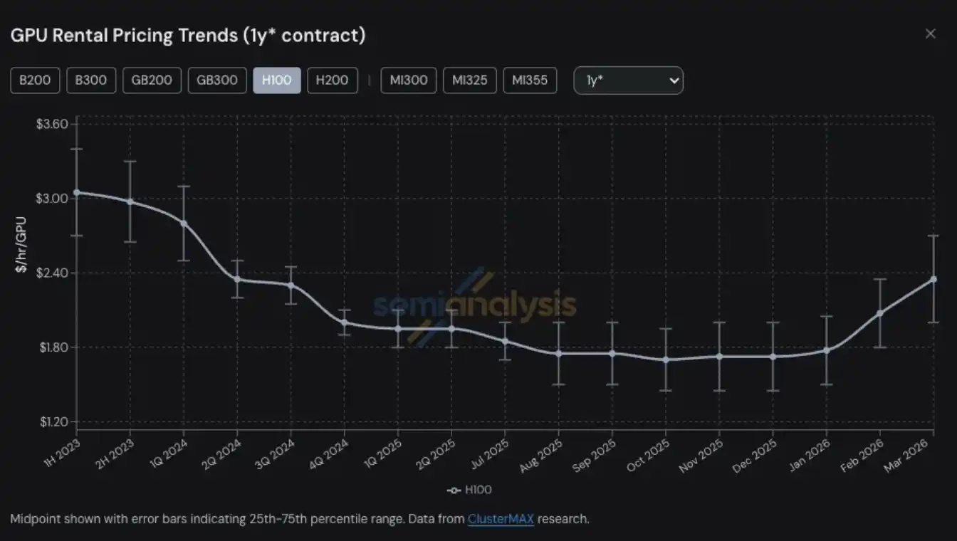 GPU 租赁价格,已成为众多算力相关产品与服务中,最新一个出现供给紧张、价格跃升的领域。H100 一年期 GPU 租赁合约价格,从 2025 年 10 月的低点每 GPU 每小时 1.70 美元,上涨至 2026 年 3 月的 2.35 美元,涨幅接近 40%。