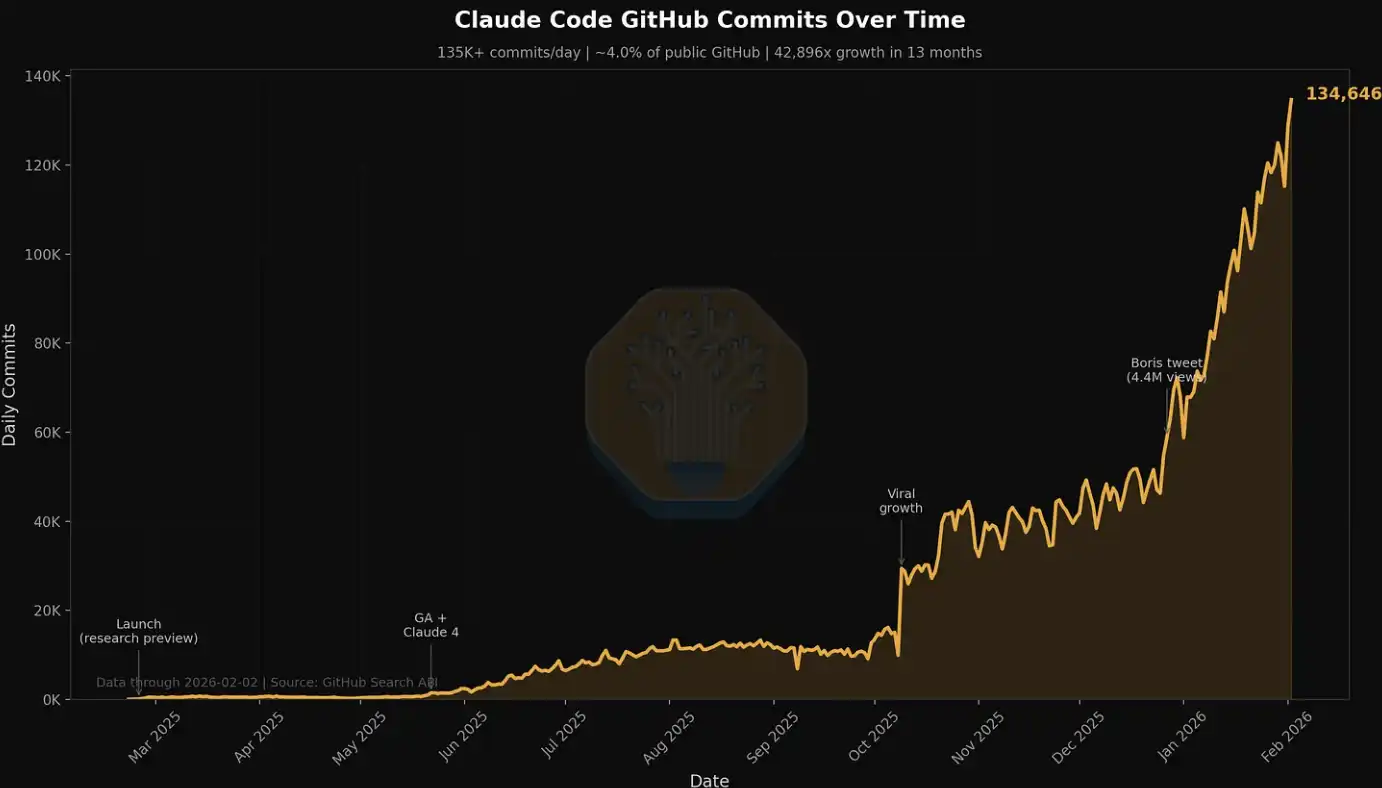 我们也通过诸如 Claude 每日提交量(Claude Commits Daily)等指标,来跟踪这一需求的爆发式增长。按照当前趋势,我们预计到 2026 年底,Claude Code 将占据全部代码提交量的 20% 以上。可以说,在你尚未察觉的时间里,AI 已经开始「吞噬」整个软件开发流程。对于希望获取该数据集的机构客户,可联系我们的 API 团队。提前透露一点:这一提交量,已经明显高于我们最初发布时的水平。