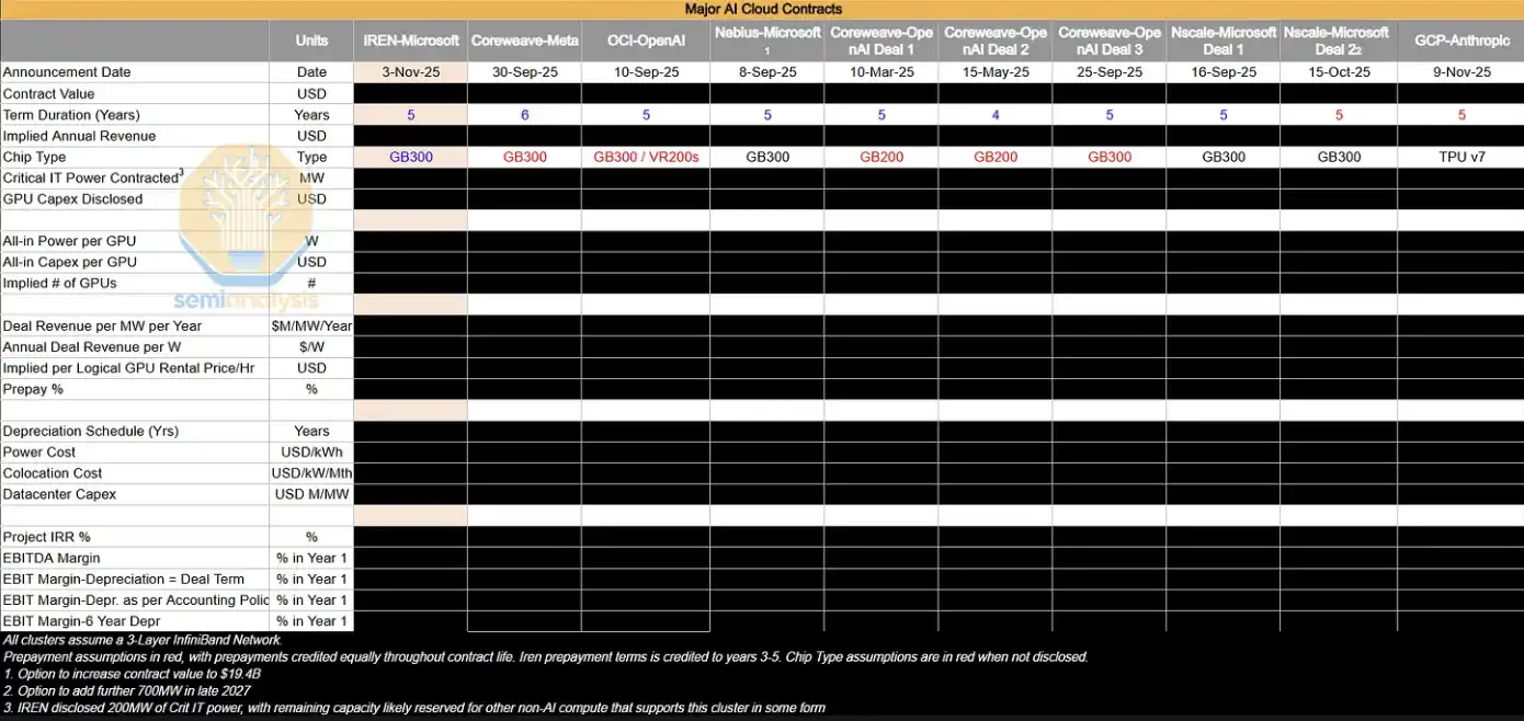 下表列出了我们正在跟踪的一些大型包销协议。我们会对这些交易进行深入分析,以反推出其隐含的 GPU 小时价格($/hr/GPU),以及项目 IRR、EBIT 利润率等关键盈利指标。