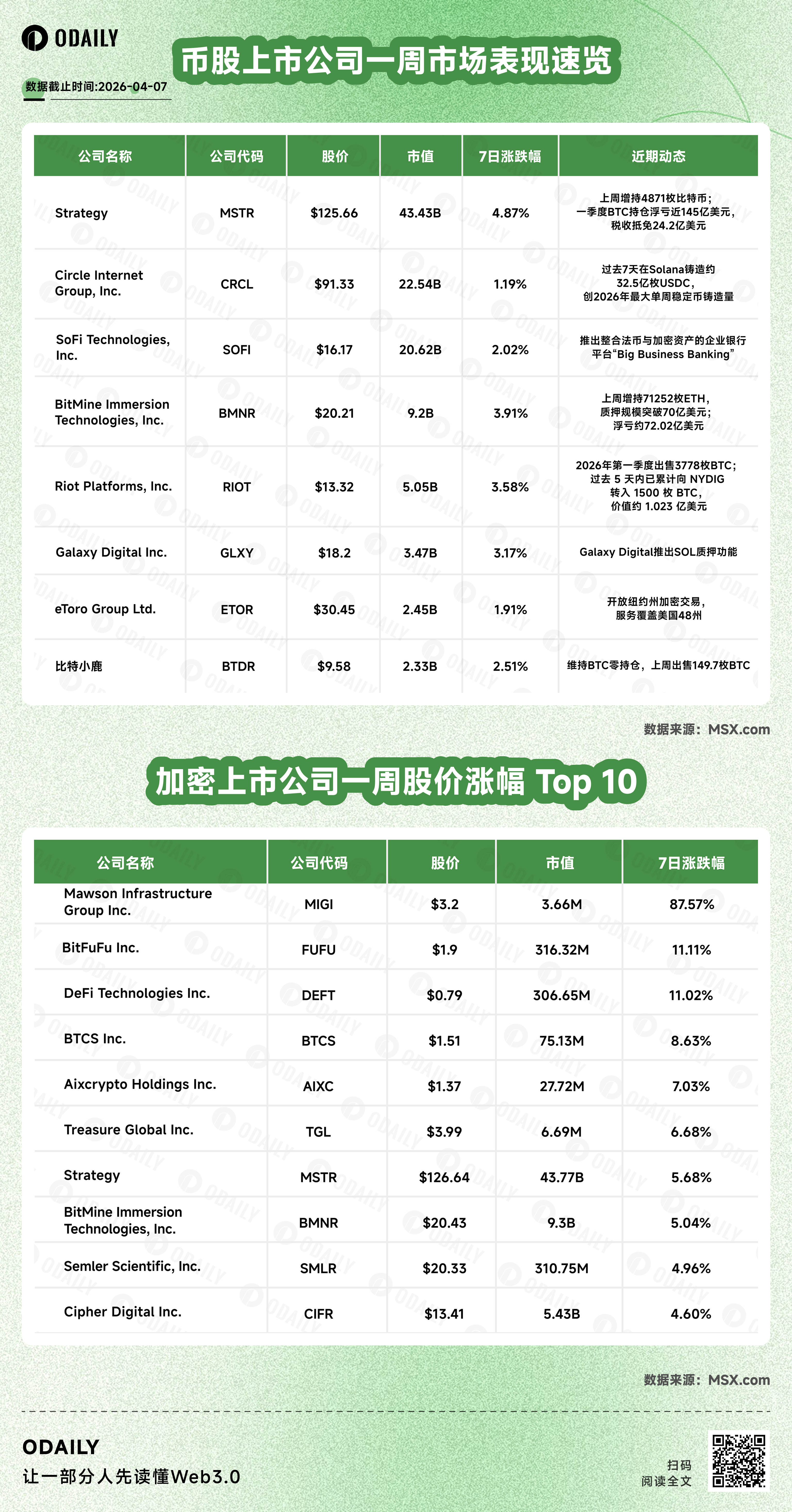 以下为 Odaily 星球日报总结整理的上周币股市场信息,所有美股数据皆来自msx.com。