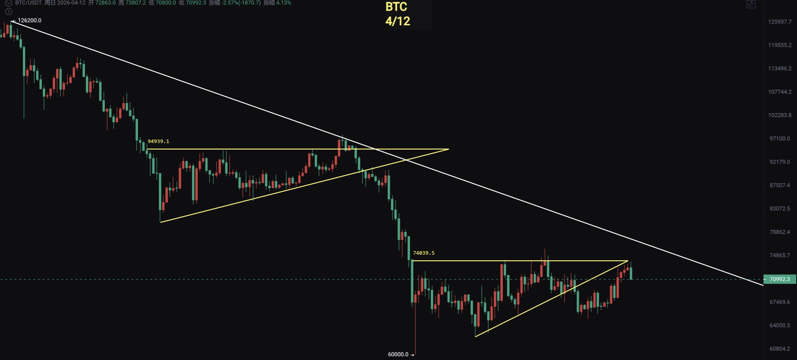 26/04/12BTC即将面临变盘,美谷上周跳空高开,关注山寨超跌反弹