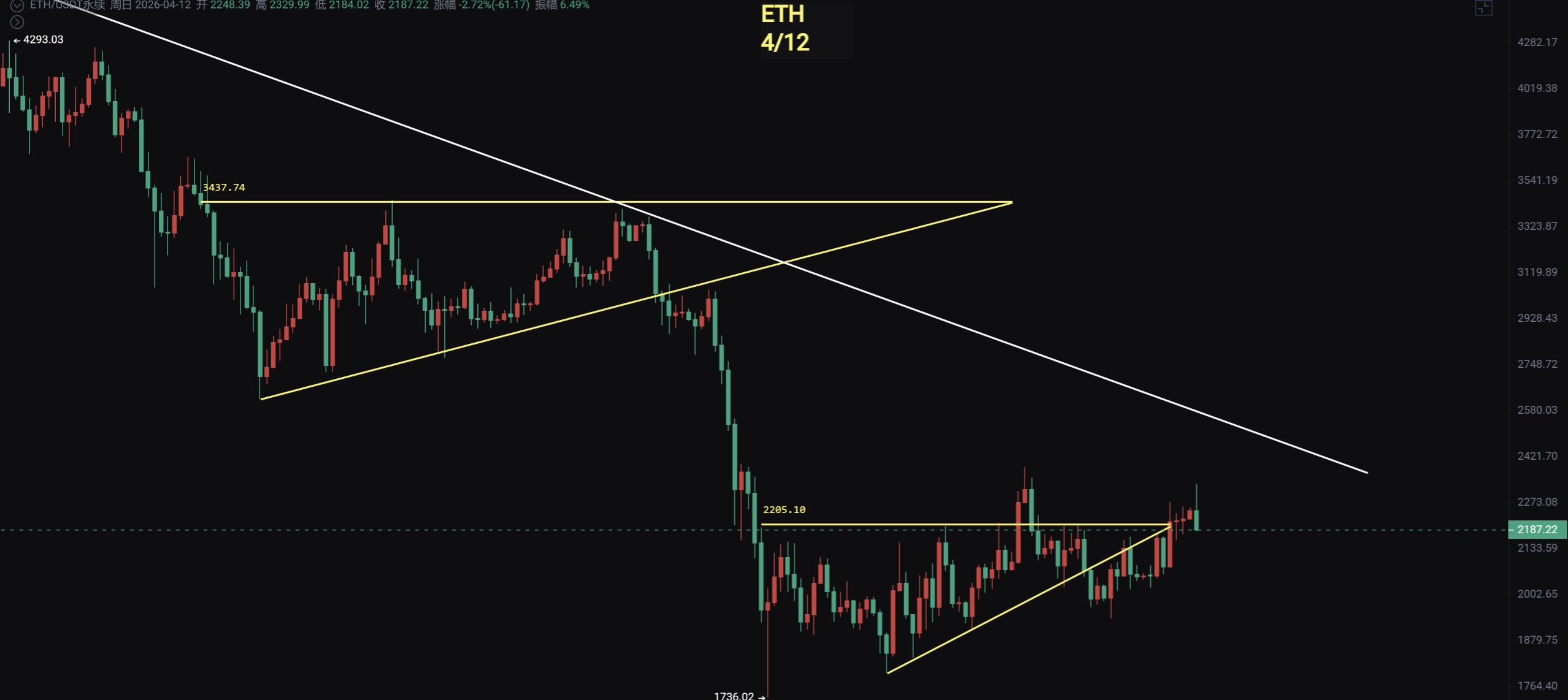 币圈丽盈:4.13以太坊多空在2180附近争夺,突破方向决定短期走势!最新行情分析操作建议