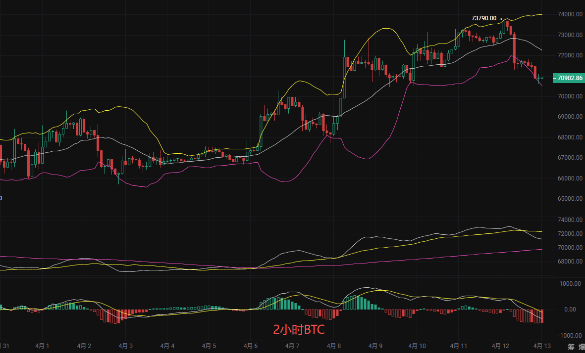 家人们!比特币现价70900,处于高位回调后的震荡企稳阶段。价格自高点73790回落,现围绕布林带中轨71294与MA30震荡,布林带开口收窄,上轨73790构成短期压力,下轨68798为强支撑区。MACD双线在零轴上方死叉,绿柱逐步收敛,显示短期空头动能减弱,但多头尚未完全反攻。MA120构成中期支撑,若价格能守住该位,趋势或转为震荡上行;若跌破,则可能开启深度回调。