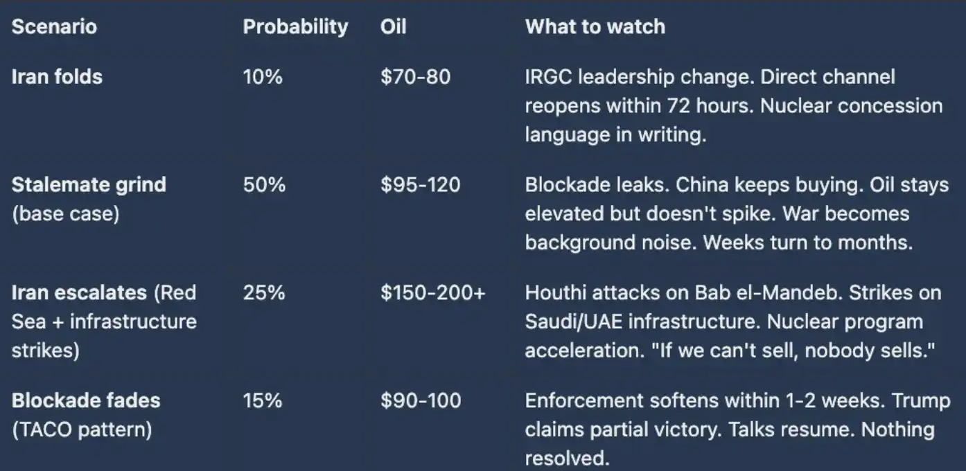 情景四:封锁失效(TACO 模式)。概率 15%,油价 90–100 美元,观察信号为 1–2 周内执行力度减弱、特朗普宣布「阶段性胜利」、谈判重启,但核心问题未解决。