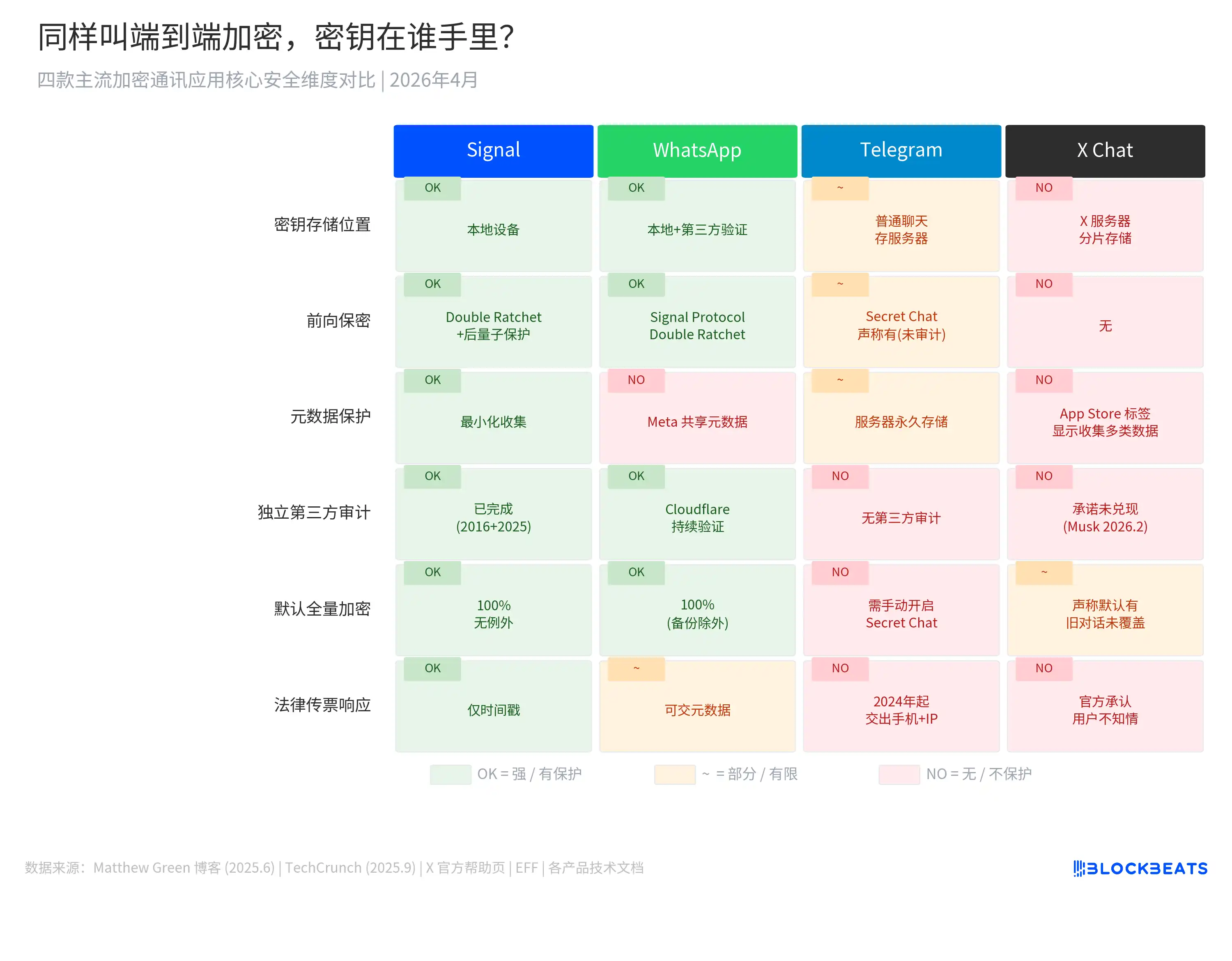 上图对比了 Signal、WhatsApp、Telegram 和 X Chat 六个维度的安全机制。X Chat 是四者中唯一由平台方持有密钥的,也是唯一没有前向保密(Forward Secrecy)的。