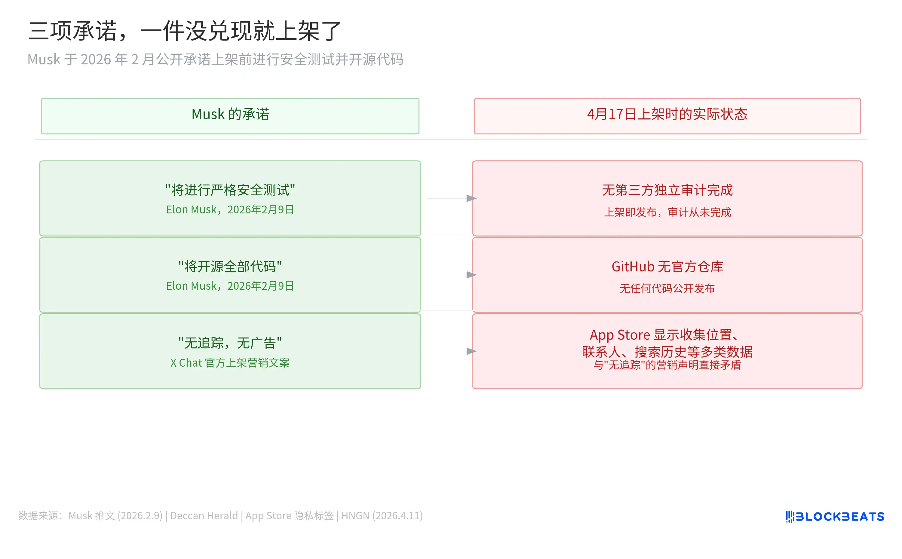 截至 4 月 17 日上架,没有独立第三方审计完成,GitHub 上没有官方代码仓库,App Store 的隐私标签显示 X Chat 收集位置、联系信息、搜索历史等五类以上数据,与上架营销文案「No Ads, No Trackers」的表述直接矛盾。