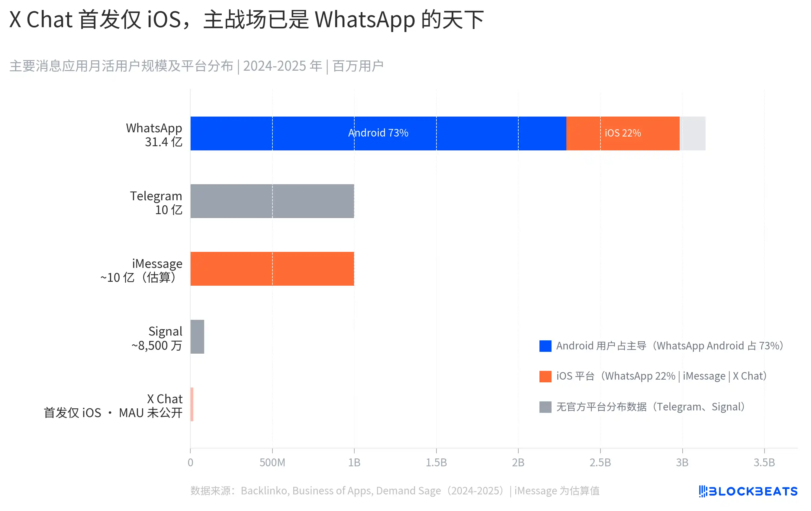 X Chat 绕开了这个战场,有两种解读。一是技术债,X Chat 用 Rust 构建,跨平台支持并不容易,iOS 优先可能是工程节奏。二是战略选择,美国市场 iOS 占有率接近 55%,X 的核心用户群在美国,iOS 优先等于集中打自己的基本盘,而不是去 Android 主导的新兴市场和 WhatsApp 正面交手。
