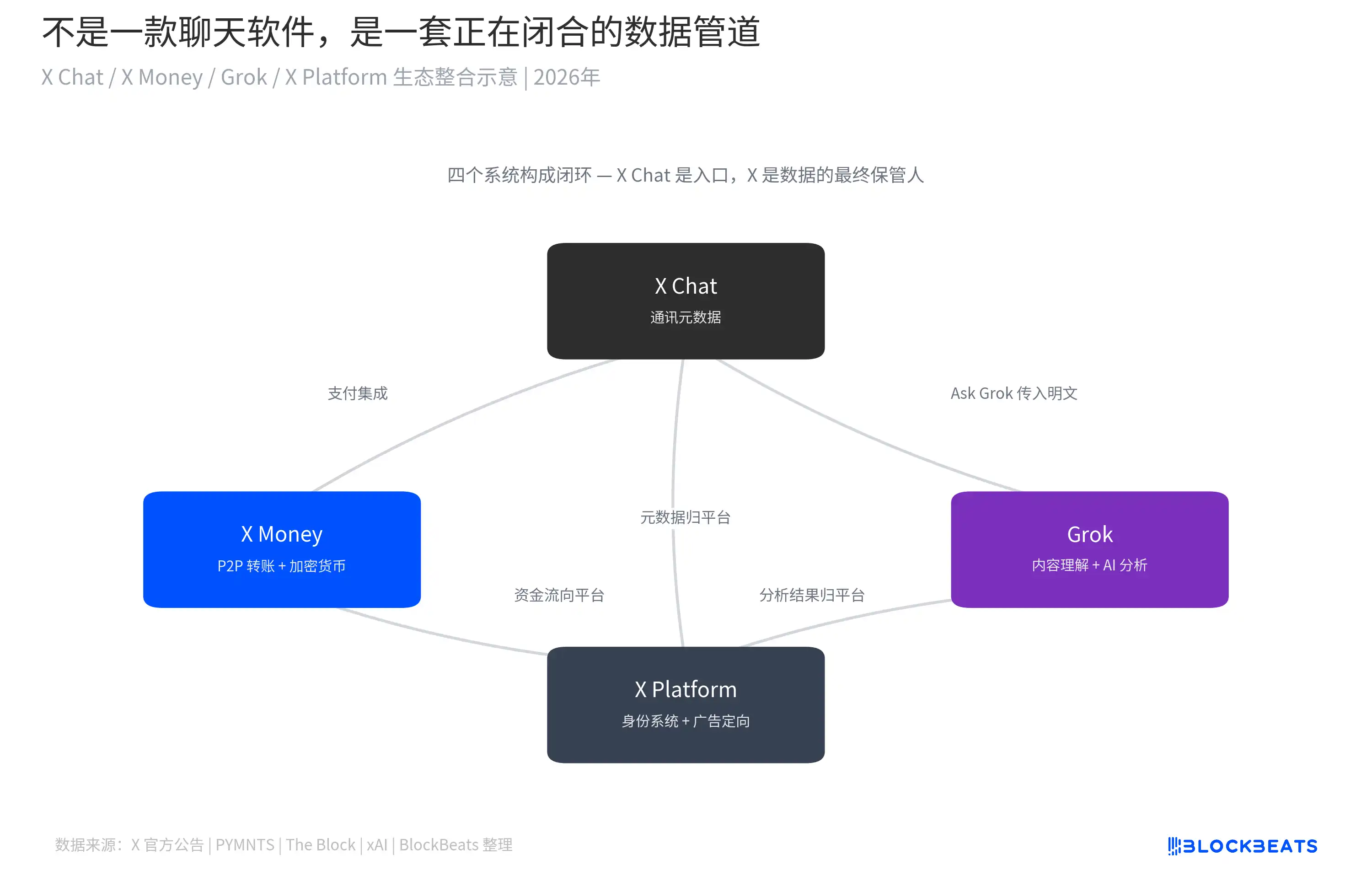 这件事已经有人描述过了:X Chat 加上 X Money 加上 Grok,三个系统构成数据闭环,平行于现有基础设施,逻辑上和微信生态相同。这个判断不是新的,但在 X Chat 上线这个节点,值得把接线图再看一遍。