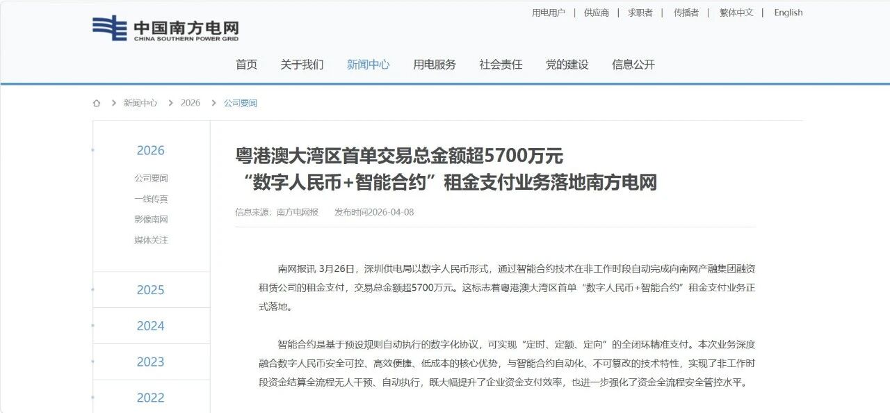 根据新华财经4月7日报道,3月26日,南方电网深圳供电局以数字人民币形式,通过智能合约技术成功完成一笔超5700万元的租金支付,标志着粤港澳大湾区首单「数字人民币+智能合约」租金支付业务正式落地。这笔在深夜悄然完成的交易,表面上只是数字人民币应用场景的一次拓展,但在更深层面上,它指向了一个正在发生的结构性变化:企业的资金管理逻辑,正在从「人工流程驱动」向「技术协议驱动」迁移。