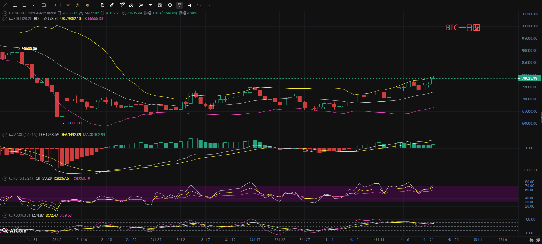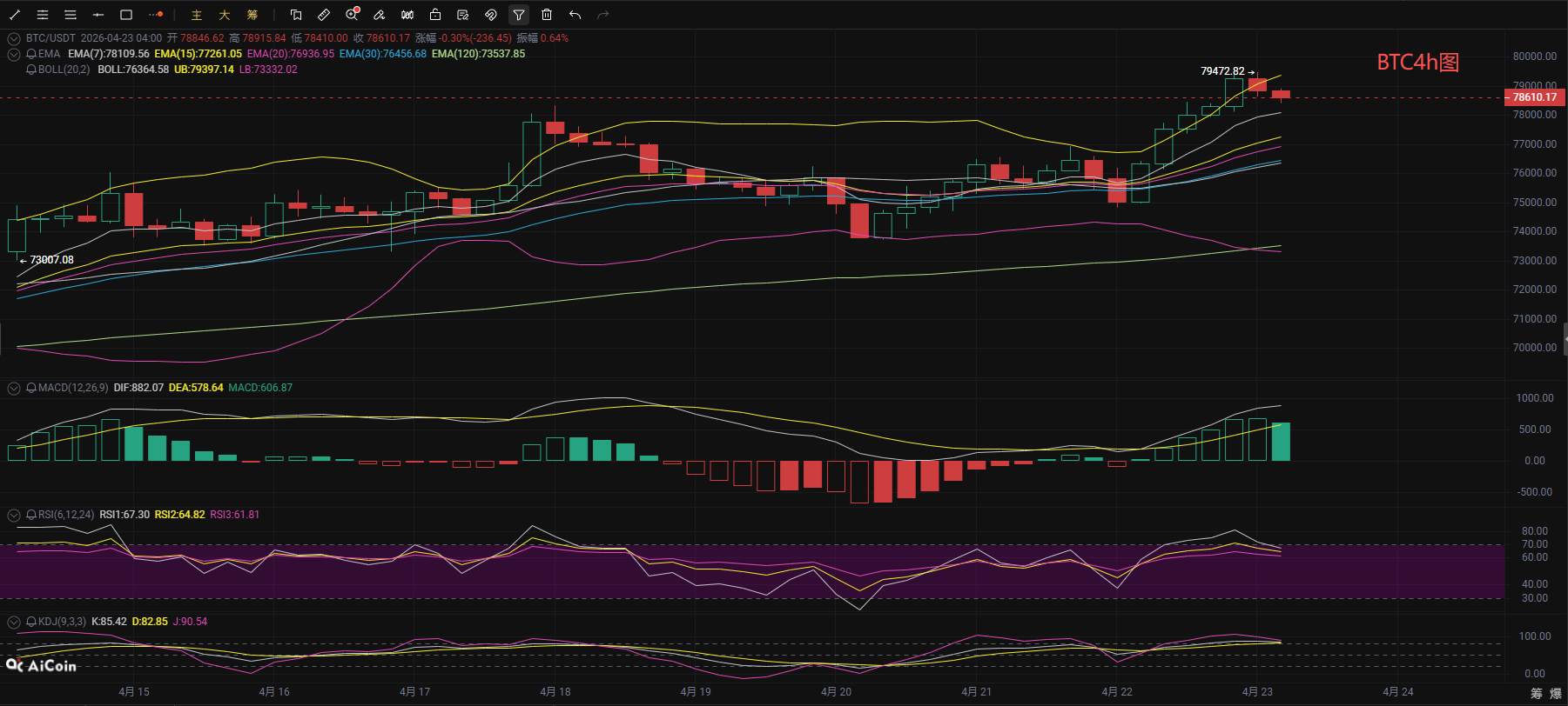 比特币昨日迎来一波强势反弹拉升,币价持续上探高位触及79400一线后承压回落,截至发稿,币价在78600附近运行。从日线级别图观察,BTC日线处于明确的多头趋势中,价格依托布林带上轨稳步上行,各周期EMA均线呈多头排列,形成了层层支撑;MACD指标在零轴上方持续金叉,多头动能尚未出现明显衰减;RSI与KDJ虽处于超买区间,但未出现高位死叉或拐头信号,说明当前多头力量仍占主导。整体来看,日线级别的上升结构保持完整,短期大概率延续高位震荡偏强的走势,下方短期支撑先看EMA7,但只要EMA15不被有效跌破,上行趋势就不会被破坏,后续仍有挑战前高甚至刷新高点的可能性。