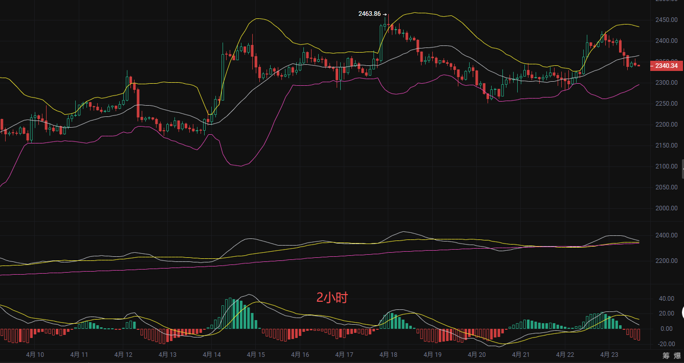 各指标技术分析价格运行在布林带中轨2363下方、下轨2290上方,布林带呈收口状态,暗示短期波动可能收窄,方向选择在即。均线系统中,MA7、MA30、MA120呈纠结状态短期均线与中期均线几乎粘合,说明多空力量暂时均衡,下方MA120与布林带下轨2290共同构成关键支撑区。MACD指标显示,DIF与DEA在零轴附近死叉后向下发散,绿色动能柱持续放大,确认短期空头动能占优。但需结合价格结构:若价格跌破2300布林带下轨MA120则回调风险加剧;若在2300-2340区间企稳,仍有反弹挑战2400的可能。