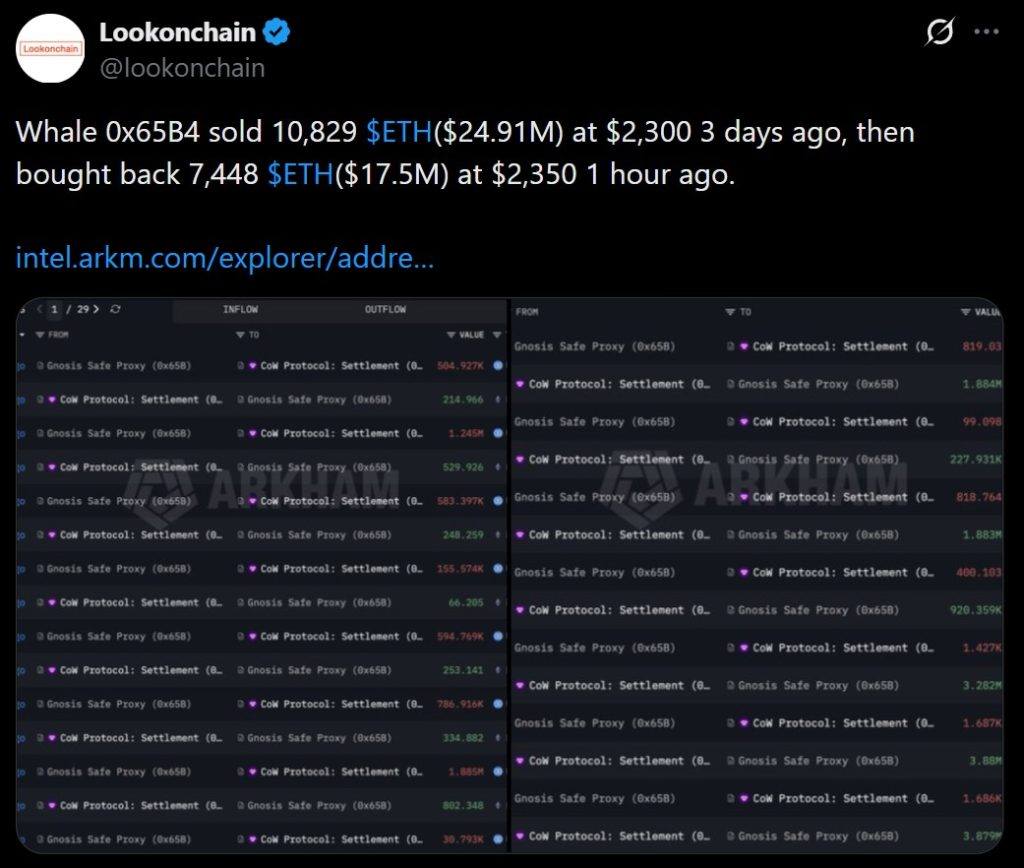 • 钱包 0x65B4 在 $2,350 的价格回购了 7,448 个以太坊,价值 1750 万美元,几天前以 $2,300 的价格售出了 10,829 个以太坊。