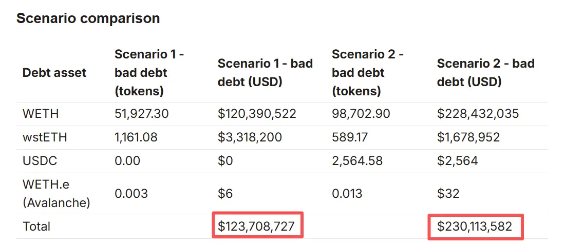 这批无抵押的 rsETH 被当作合规抵押品接受,借出的真实 WETH 却无法被等价覆盖,导致 Aave 面临最高 2.301 亿美元的坏账敞口。