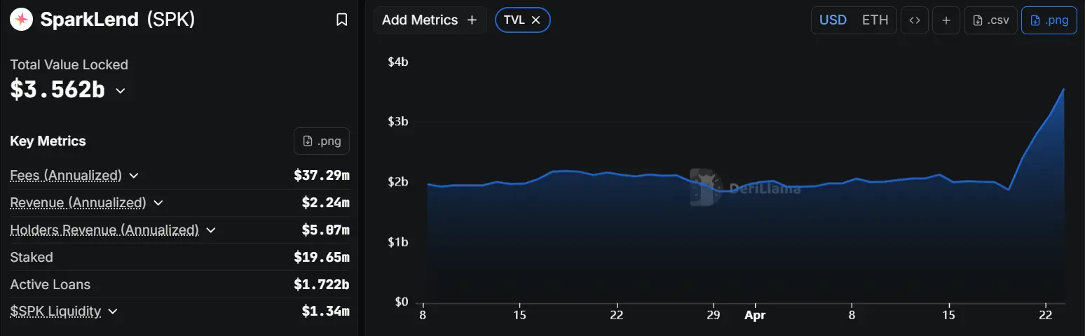 没有人预料到,这场 Aave 坏账风波最大的短期受益方竟是 Spark。资金从 Aave 大规模出逃后,部分直接流入 Spark。最新 DefiLlama 数据显示,其 TVL 已从事件前的约 19 亿美元快速升至 33-35 亿美元 级别(增长超过 80%),部分归因于孙宇晨等大户的持续注入。