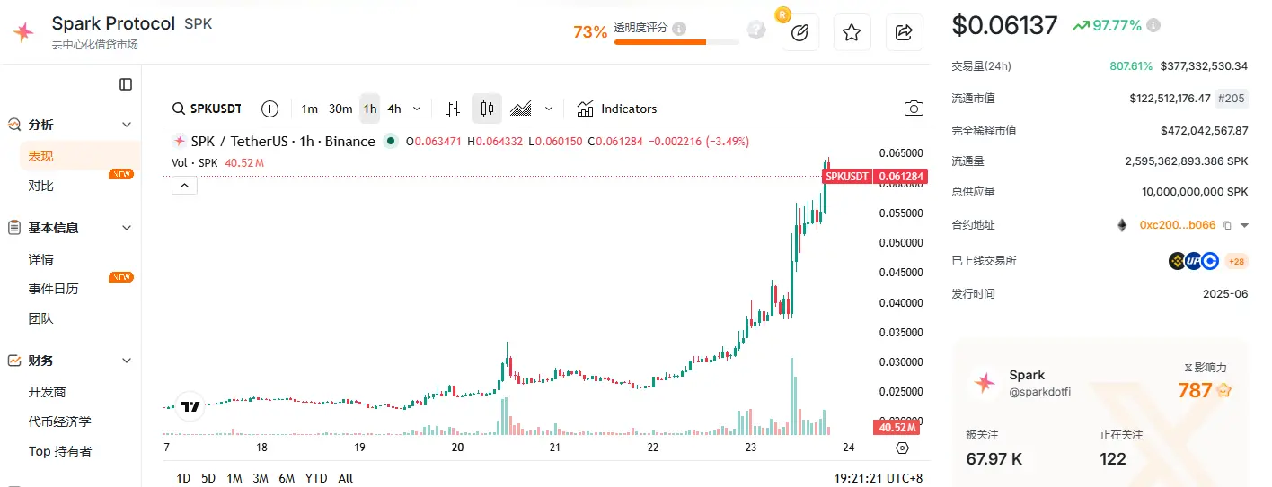 与此同时,SPK 代币价格出现强劲反弹:截至发稿,SPK 过去 24 小时涨幅一度超过 95%,近 7 天涨幅超过 180%。F2Pool 联合创始人王纯发文感慨,他在过去一年从 Spark 收到 8370 万枚 SPK 奖励,并在 CoWSwap 上全部卖出,换得 663 枚 ETH 和 140 万美元,如今“有点后悔”。