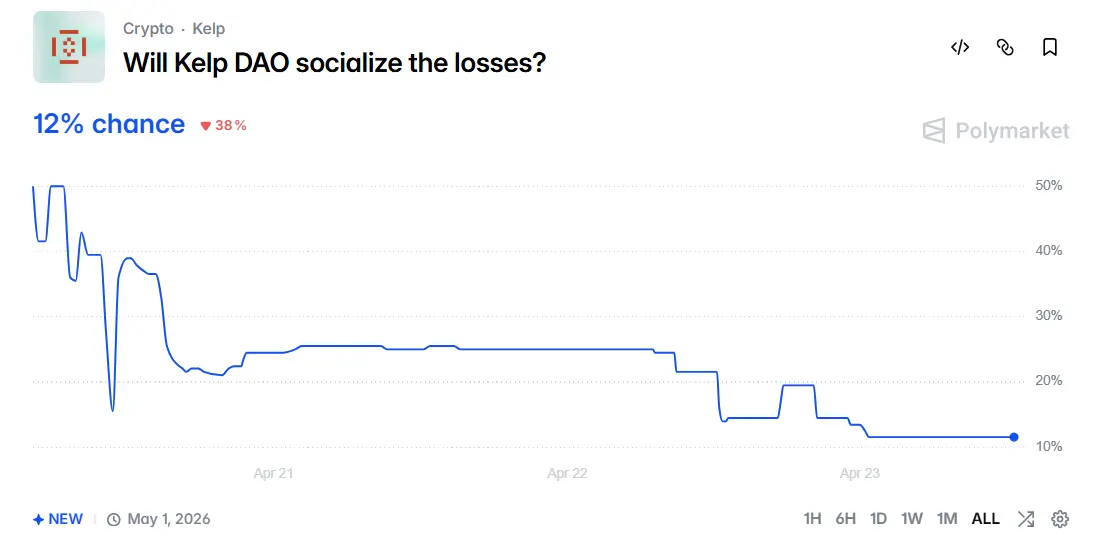双方至今未达成明确的责任划分或补偿框架,Polymarket 最新数据显示,市场押注“Kelp 将分担损失”的概率已从事件初期的 50% 进一步降至约 12%。