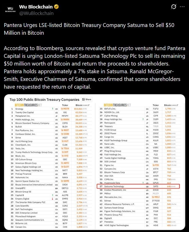 Satsuma科技在伦敦证券交易所交易,于2025年筹集了2.18亿美元的超额认购可转换债券融资,潘特拉资本是其主要支持者之一,其他支持者包括ParaFi、Kraken和DCG。这一轮融资部分以比特币结算,认购者接受了超过1.25亿美元的BTC作为现金替代。现在同一个投资者据报道正在推动公司逆转决策,完全清算其比特币头寸。