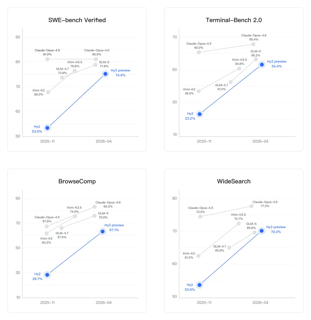 在编码方面,进步显著。SWE-bench Verified是一个基准,测试模型是否能够实际修复来自GitHub仓库的真实错误——不是玩具问题,而是生产代码。Hy2的得分为53.0%。Hy3预览的得分为74.4%。在一代之间实现了40%的飞跃,使其接近Claude Opus 4.6(80.8%)和高于GLM-5(77.8%)以及Kimi-K2.5(76.8%)。Terminal-Bench 2.0测量真实命令行环境中的自主任务执行,从23.2%提升至54.4%——同样是一个巨大的飞跃。