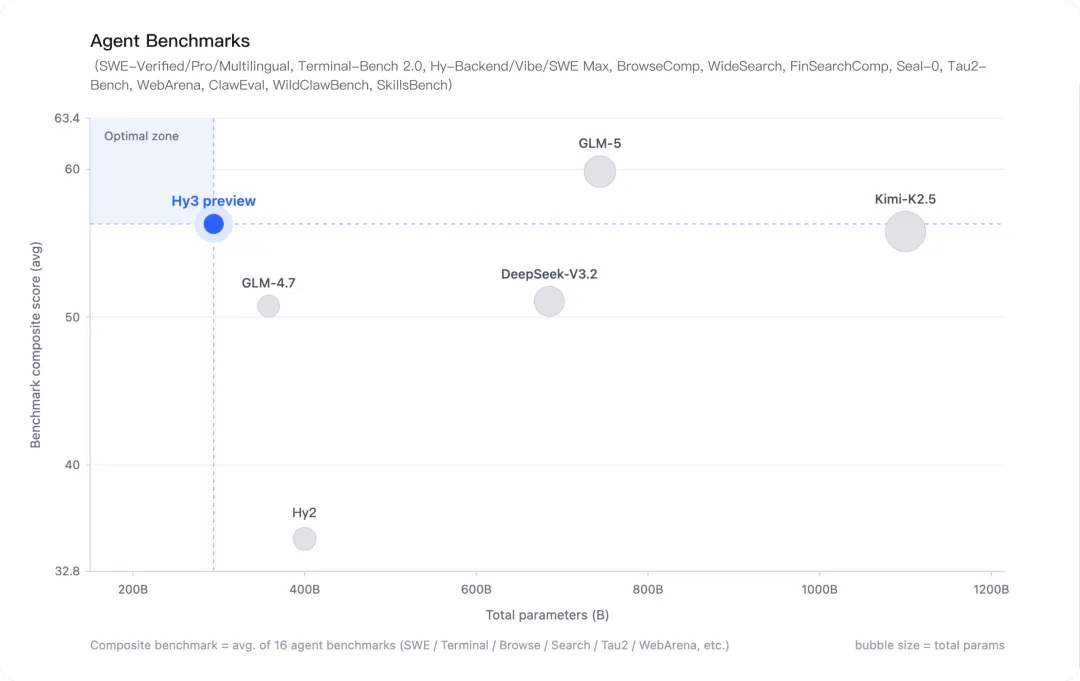 Hy3仍然落后于OpenAI和Google DeepMind的旗舰产品,但按大小与性能的比率来看,Hy3预览是难以忽视的:代理基准综合显示其位于“最佳区域”,约2950亿参数,领先于DeepSeek-V3.2(600亿+)并与Kimi-K2.5(超过1万亿参数)匹配,且计算成本仅为其一小部分。
