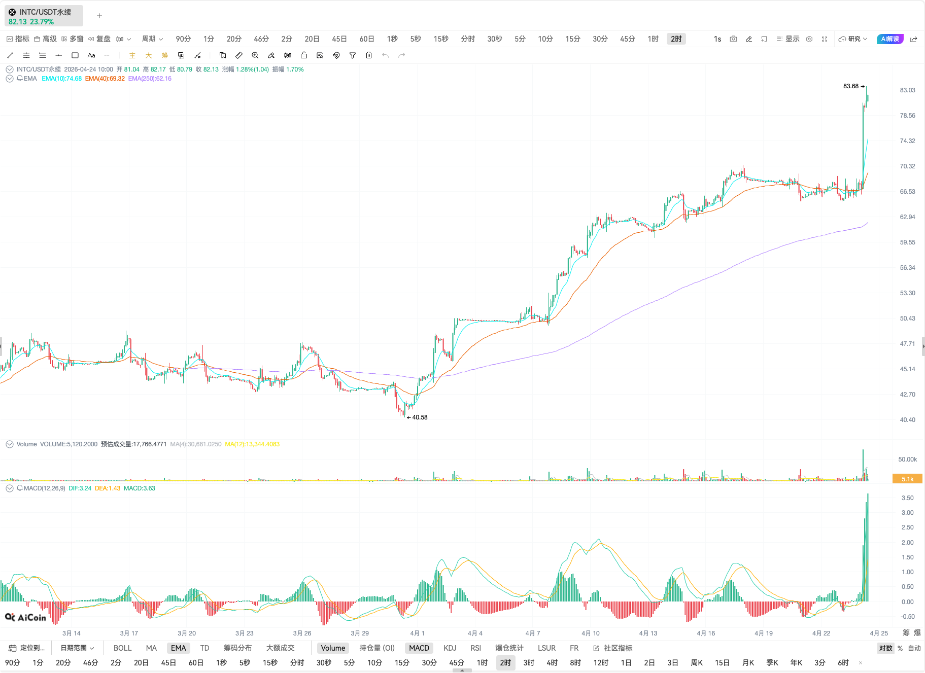 自3月底至4月初在40.540附近探明底部后,INTC价格便开启了凌厉的V型反转。截至目前,价格已飙升至81.565附近,区间涨幅超过100%,走出了标准的"翻倍行情"。在AiCoin的行情列表中,INTC/USDC以+22.95%的24小时涨幅傲视全场。