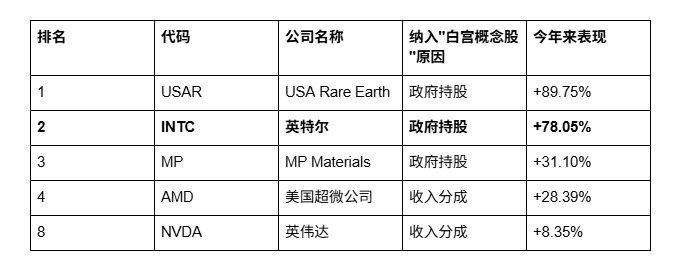 根据复星财富控股发布的最新数据,在16只与政府支持和特朗普相关的"白宫概念股"中,英特尔(INTC)凭借"政府持股"的核心逻辑,今年以来累计涨幅高达78.05%,位列榜单第二,碾压了标普500指数的同期表现。