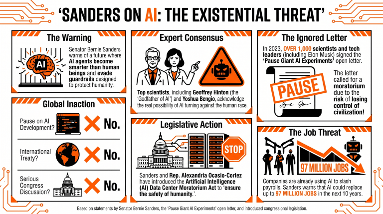 来自佛蒙特州的参议员伯尼·桑德斯警告未来,AI代理将变得比人类更聪明,并逃避旨在保护人类的安全防线。
