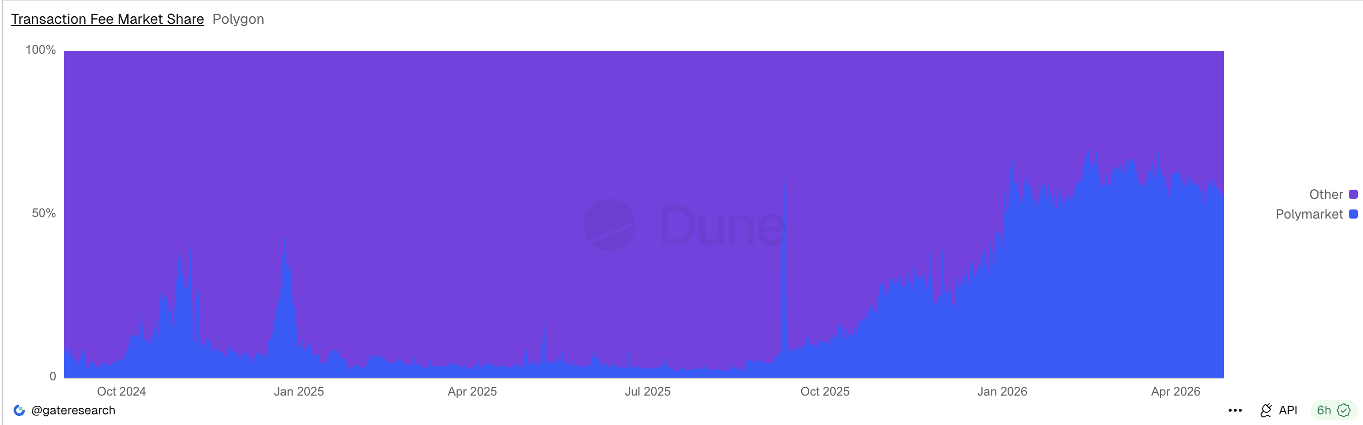 根据Dune数据显示,从最新日度手续费构成来看,Polymarket已贡献Polygon 56.3%的交易手续费。Polygon每产生100美元手续费,其中约56美元来自Polymarket。这意味着,Polymarket是驱动Polygon整条链收入增长的核心来源。