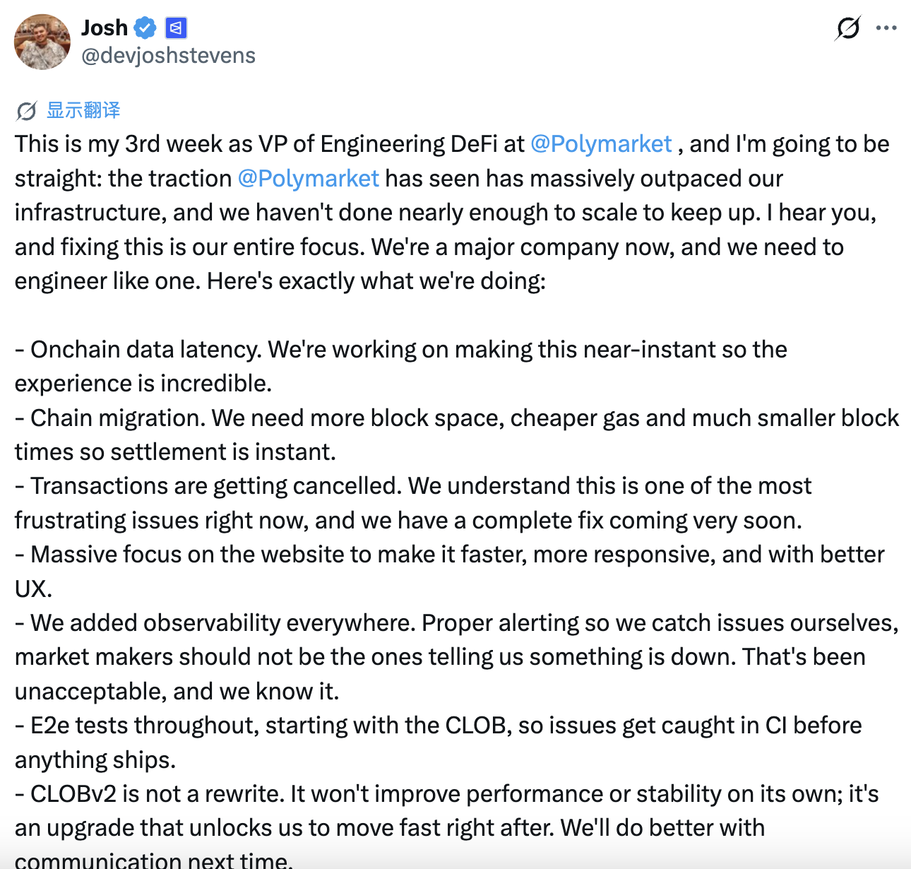 Josh Stevens坦言,当前公司的工程能力尚未匹配其业务增长速度,过去一段时间确实让用户失望。他承诺未来几个月将持续推进重大改善,并从下周五起按周发布工程进展更新,以提升透明度并重建市场信心。