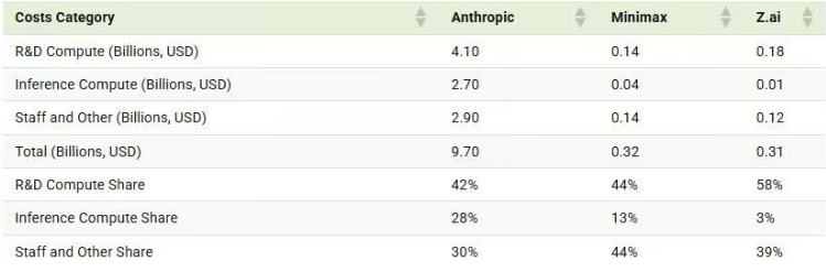 在规模最大的 Anthropic,2025 年全年总支出估计达 97 亿美元,其中仅算力一项便高达 68 亿美元,涵盖模型训练与推理两大环节。这一数字远超同期两家 Minimax 和智谱的整体支出规模。