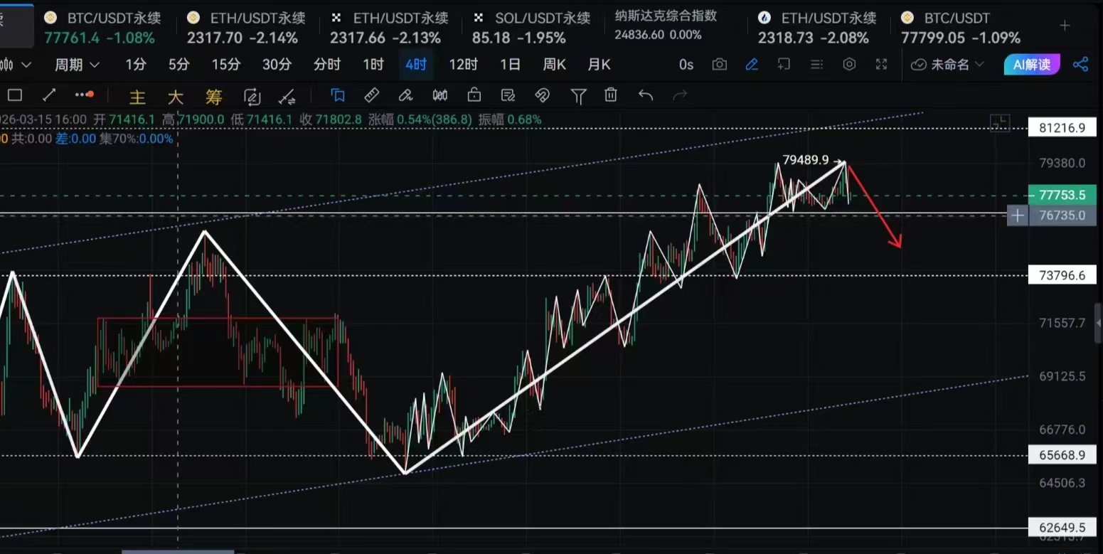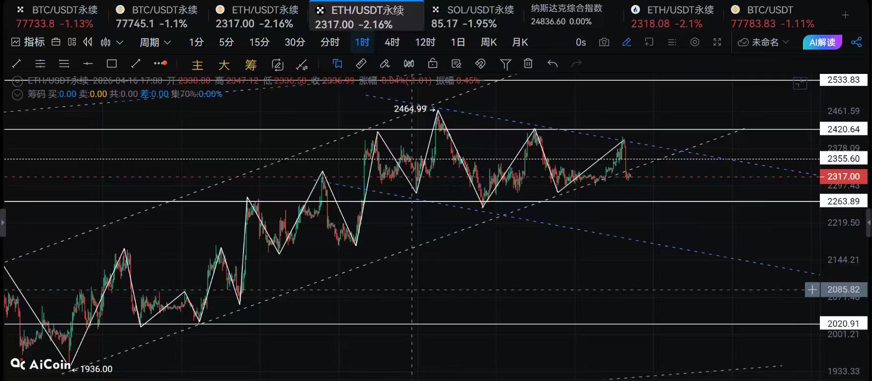 大饼当前在一小时ema120和144,77500一带,预计会下探去测试四小时ema120,75200一带。以太已经跌破一小时ema120和144,2335。不过四小时ema120和144在2280,这里大概率守不住,而日线ema30在2260。所以后市可能跌到后2260-2280后横一会。随后是走慢碾还是反弹,要看当时的反应。