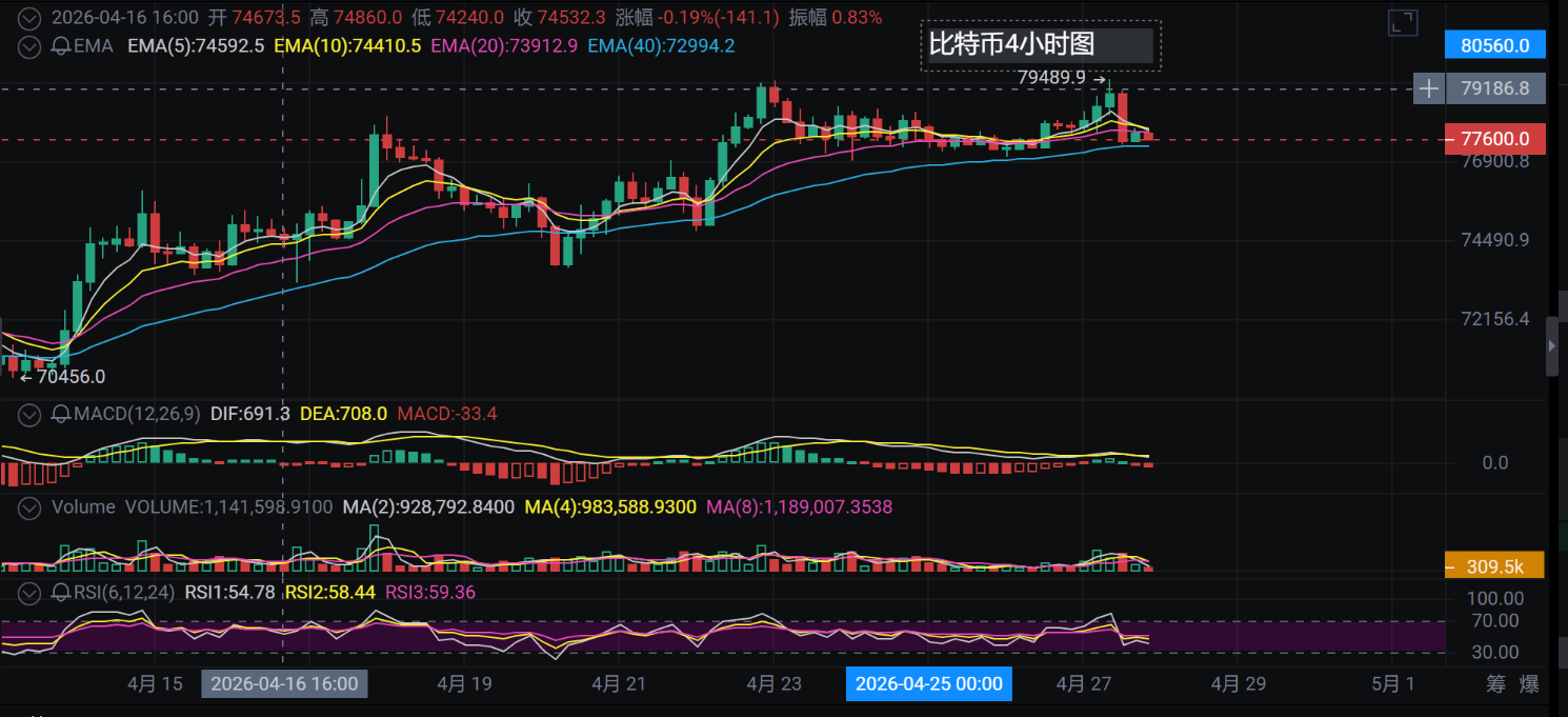 截至2026年4月27日晚,比特币的价格在 77,800美元 附近波动。整体来看,市场在经历了一轮上涨后,目前正处于高位震荡和方向选择的阶段。