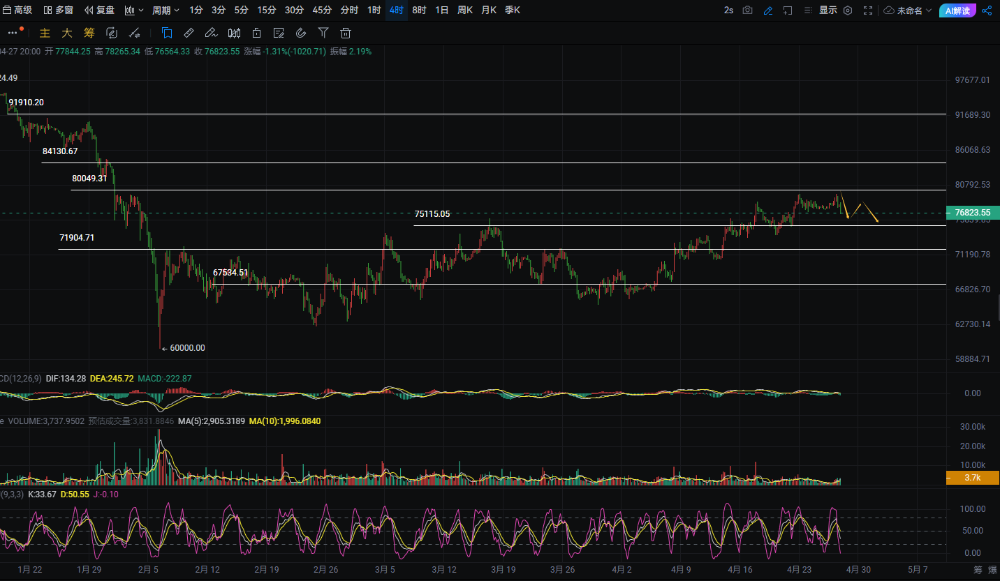 昨天的策略可谓完美的多空双杀 无缝衔接,不知道大家有没有都跟上。一天砸了两次,还得是周一的行情刺激啊,刚刚晚上这一波直接跌破77000,算是一个突破性的进展,这里也是之前咱们分析里一直提到的第一道防线,既然现在下破了,那么趋势短线的回调就会进一步发展,接下来就是看76000的强弱了。从大周期走势来看,这种级别的回落其实也算不上什么,还没有到完全改变多头格局的地步,日线多头格局依旧还在,从79400附近回落只是正常休整,MACD虽动能减弱但没背离,RSI也消化完超买,下方76000是强支撑,75000是生命线,上方78500-79400还是难冲的高压区。4小时空头动能在继续发酵,价格在中轨附近晃悠,想反弹但力气不足,整体就是调整状态,短期暂时进入空头情绪中,那么今日操作上彦灵认为可围绕78500-75000区间高抛低吸即可。