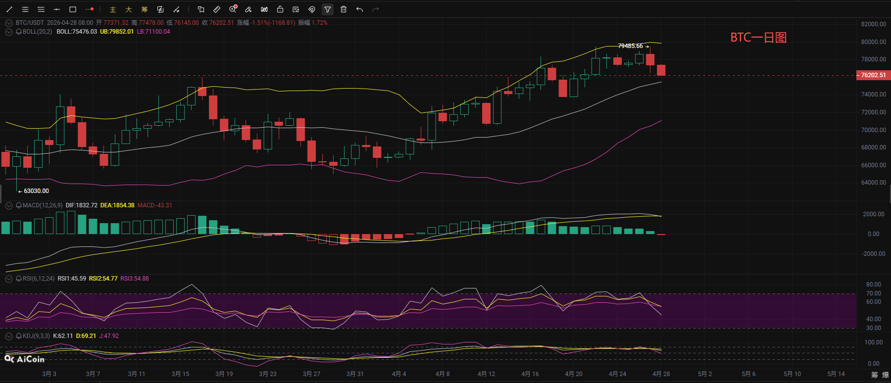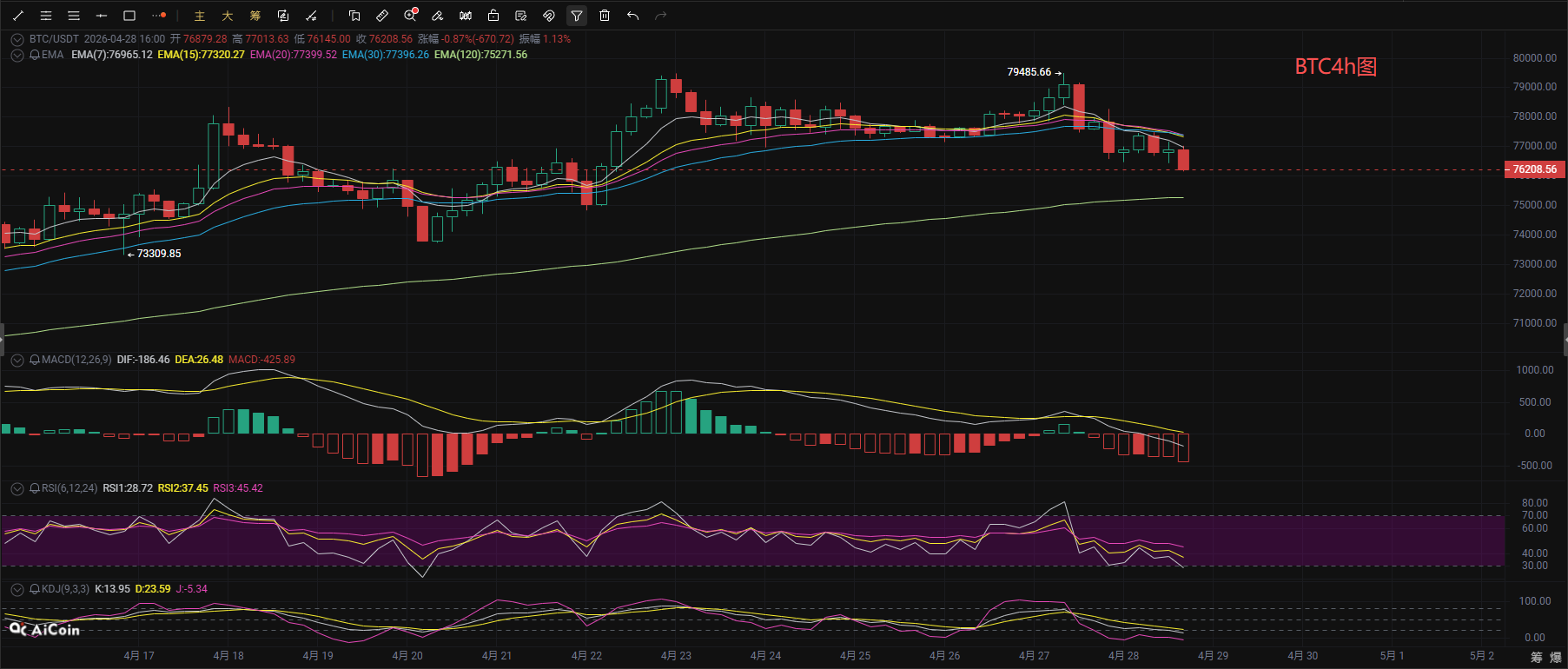 从短周期小时图延伸至4 小时级别来看,价格已跌破EMA7、EMA15等所有短期均线,均线系统形成空头排列,当前价格运行在布林带下轨附近,布林带开口向下,弱势特征显著。MACD指标的DIF线在零轴下方持续下行,柱体持续放量,空头动能不断增强;RSI回落至30附近,KDJ的J值已跌至个位数,虽出现短期超卖迹象,但尚未形成明确拐头金叉信号,短线空头主导格局未变,若无法快速收回77000上方的均线压力位,大概率会继续下探寻求支撑。