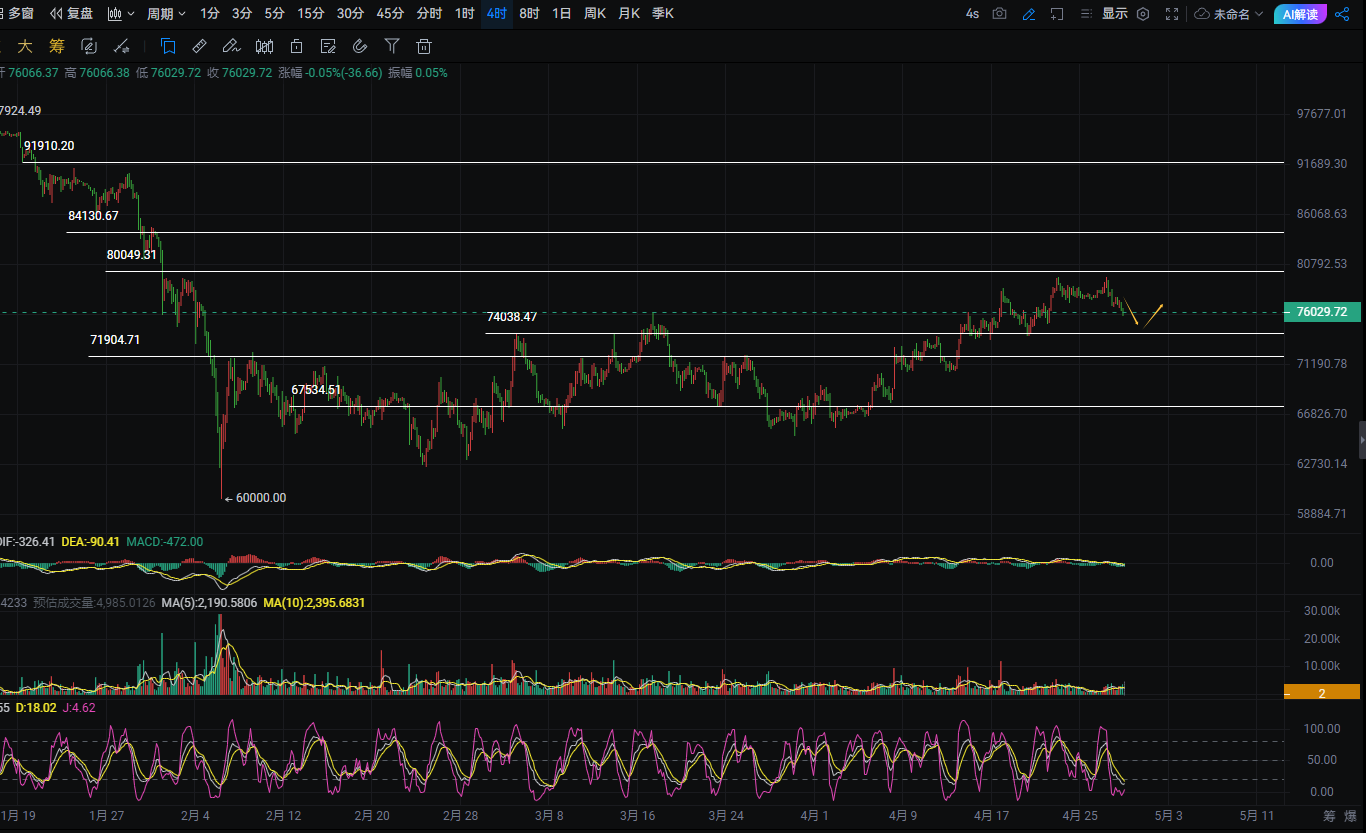 昨天行情如咱们预期一样主走下跌,空单又是完美拿下。目前大饼徘徊76000附近,日线整体依旧是多头大格局未变,高位区间震荡拉扯,整体走势慢慢走弱。价格还稳站在中期均线上方,75000依旧是多头防守底线,箱体区间锁死在74000-79500,指标中性震荡,多头动能悄悄减弱,短期存在回踩需求。4小时级别明显偏弱运行,高点不断下移,反弹力度很拉胯。75000是这波回踩的关键支撑关口,上方77500压力很关键,MACD空头动能小幅释放,短期行情继续偏震荡回落。1小时短线窄幅箱体磨洋工,多空拉扯纠结。76500就近压制反弹,75000一线暂时来看撑住了盘面,指标偏弱,成交量缩量,短线没啥强势方向。