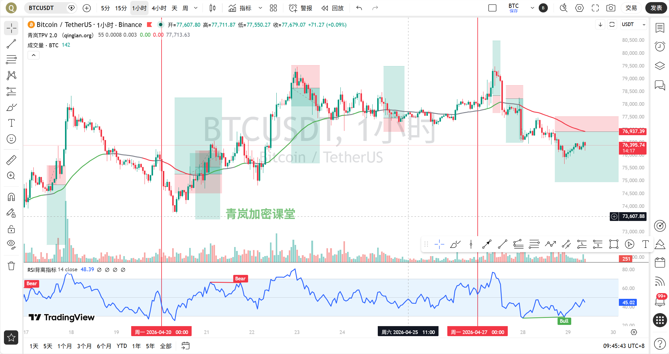 做空条件方面,第一条件价格承压在1小时EMA55下方已经满足。第二条件压力遇阻,我们需要观察近期高点。从4小时图看,价格在76800-77000区域形成明显阻力,且1小时K线多次在该区域出现长上影线,符合顶分型特征。第三条件反弹无力,1小时MACD柱虽然连续缩短,但DIF和DEA仍为负值,且RSI从52.28回落,未形成有效突破。综合来看,空头趋势完整,反弹力度不足,做空条件成立。