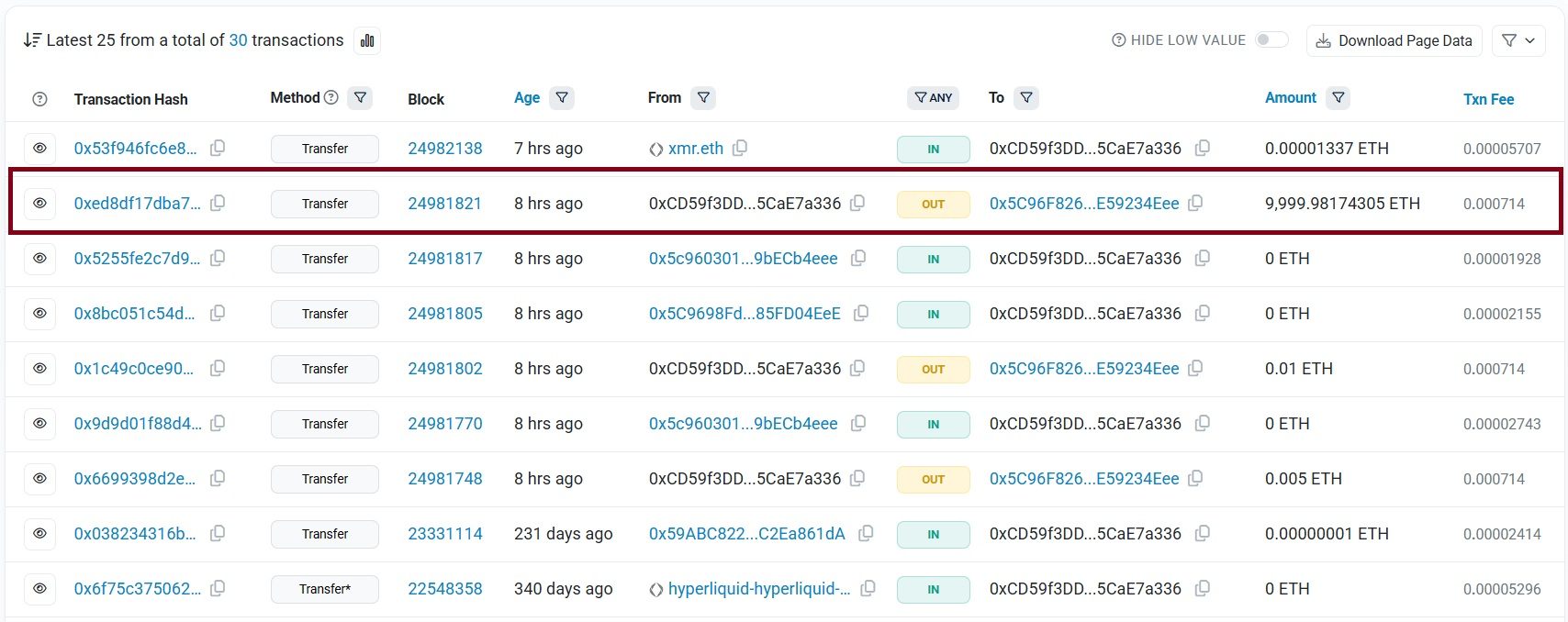 链上日志显示,用户在主要转移之前执行了细致的安全实践,特别是先进行了两笔小额测试交易,分别为0.005 ETH和0.01 ETH,以验证接收地址,然后安全迁移剩余的9,999.98 ETH批量余额。