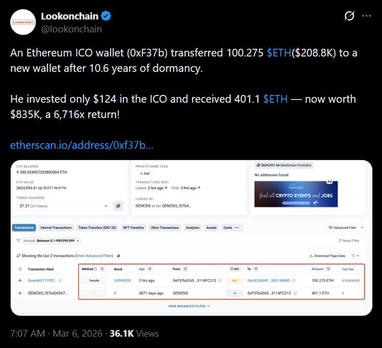 • Lookonchain在2026年更广泛的早期以太坊ICO钱包重新激活的背景下标记了此转移。