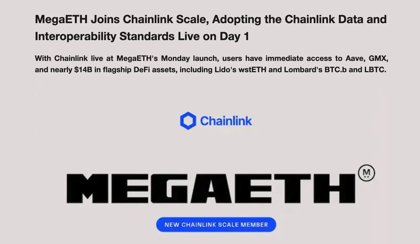 值得一提的是,Aave V3、GMX 以及 Chainlink Scale 项目从主网第一天便已集成上线,实现近 140 亿美元旗舰资产(包括 wstETH 与 LBTC)的访问入口。这些蓝筹 DeFi 协议的入驻,更确立了 MegaETH 作为生产级基础设施的定位,而非仅靠原生应用撑起生态繁荣幻觉。