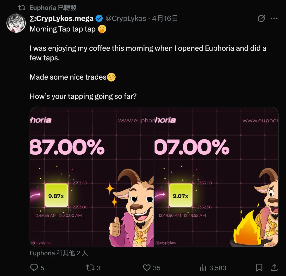 Euphoria 的核心玩法是“Tap Trading”机制,用户只需在网格界面上点击方格,即可对短期价格走势进行预测,将交易体验进一步游戏化与社交化。但目前 Euphoria 主网仍处于封闭测试阶段,仅开放给 AMA 参与者及早期测试用户,不过随着 5 月中旬全面公测临近,市场普遍认为它将成为 MegaETH 2.0 生态中最受瞩目的消费级应用之一。