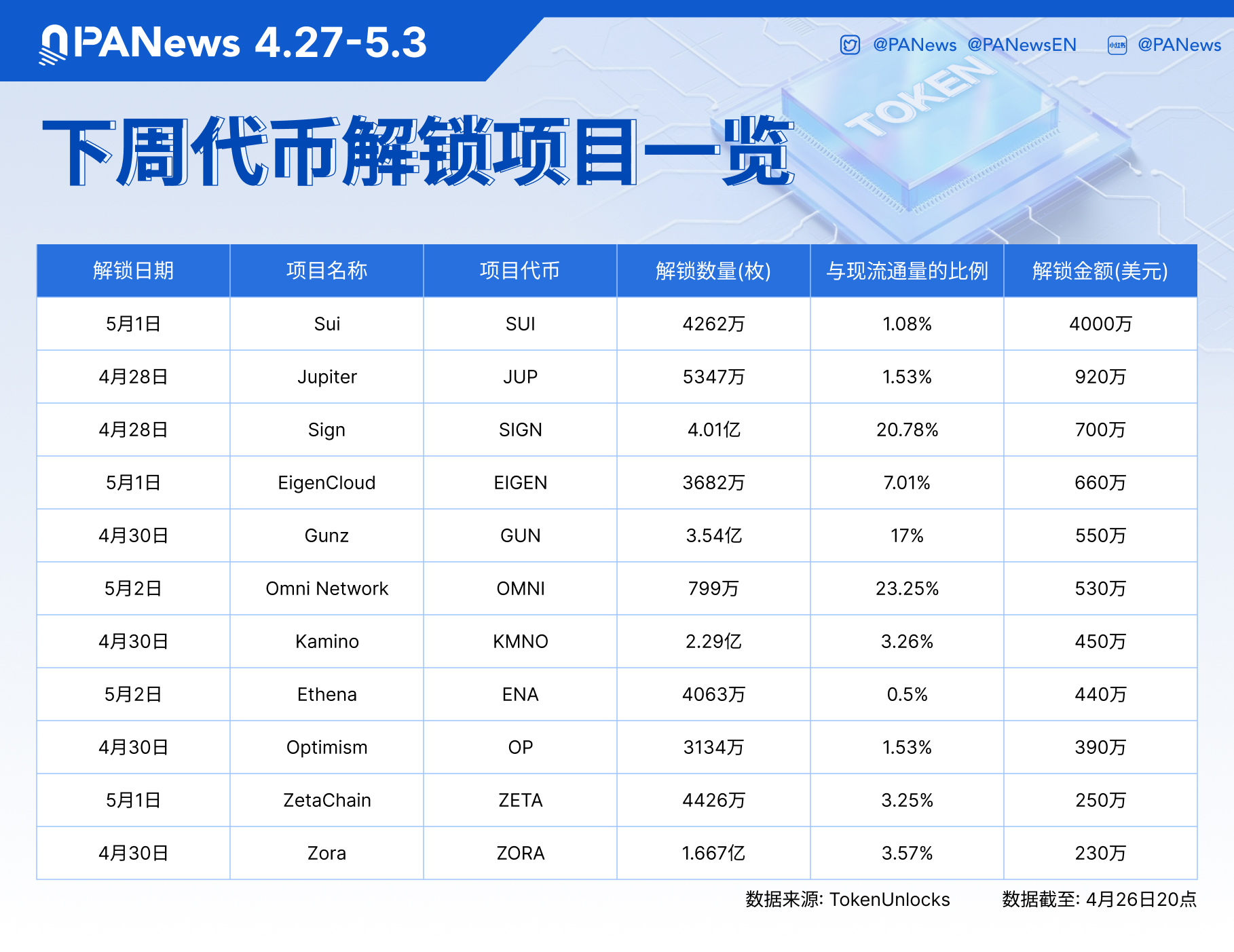 PANews 4月26日消息,Token Unlocks 数据显示,SUI、JUP、SIGN 等代币将于下周迎来大额解锁,其中: